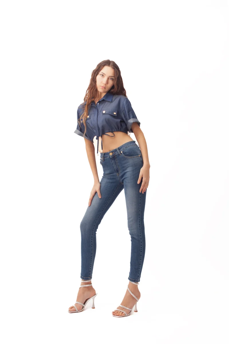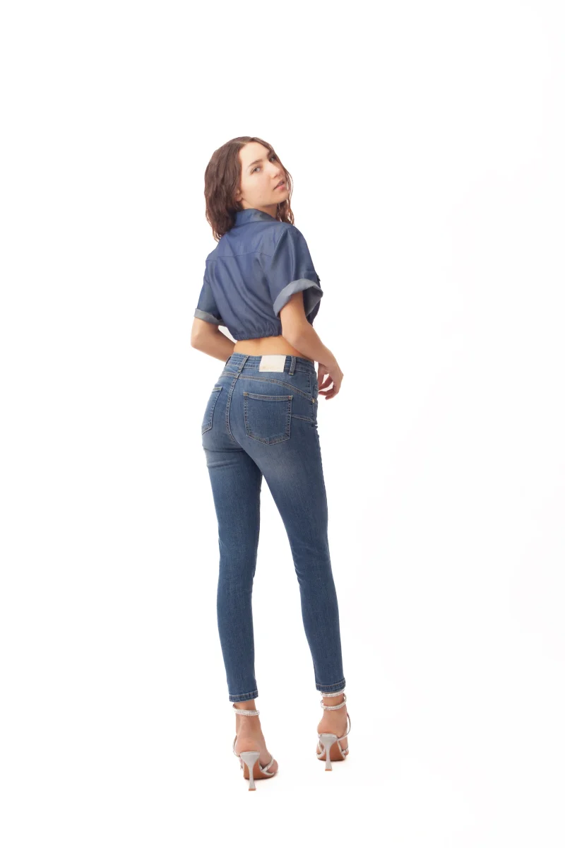 La classica struttura 5 tasche combina praticitร  e stile, rendendo questo modello un capo versatile da indossare in ogni occasione. Ideale per look casual o piรน ricercati, si abbina facilmente ai capi della collezione Nexos per un outfit contemporaneo e femminile.