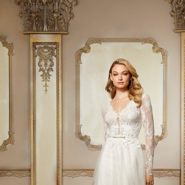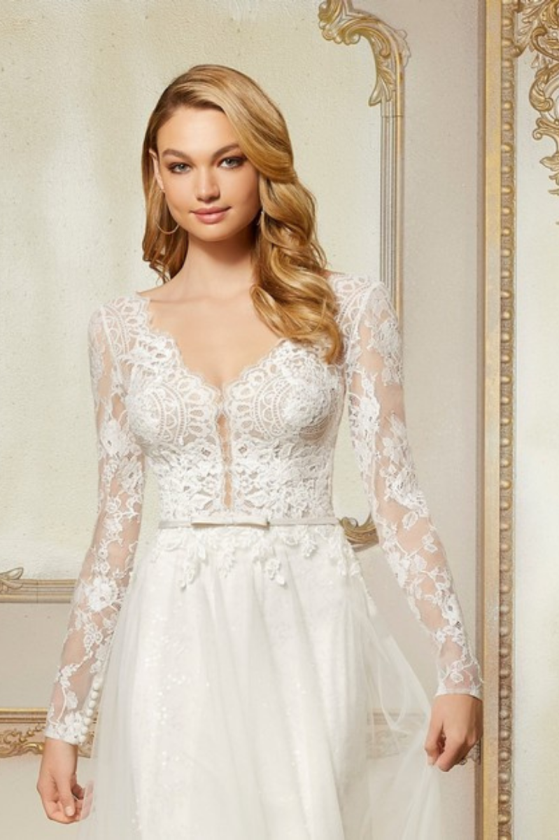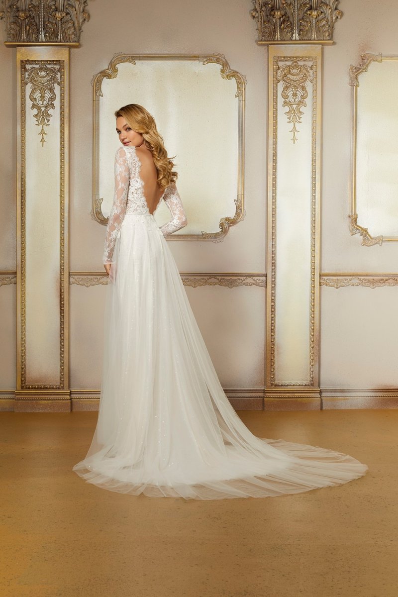 Morbide applicazioni su un corpetto in pizzo allover chantilly, gonna in tulle morbido su tulle con paillettes