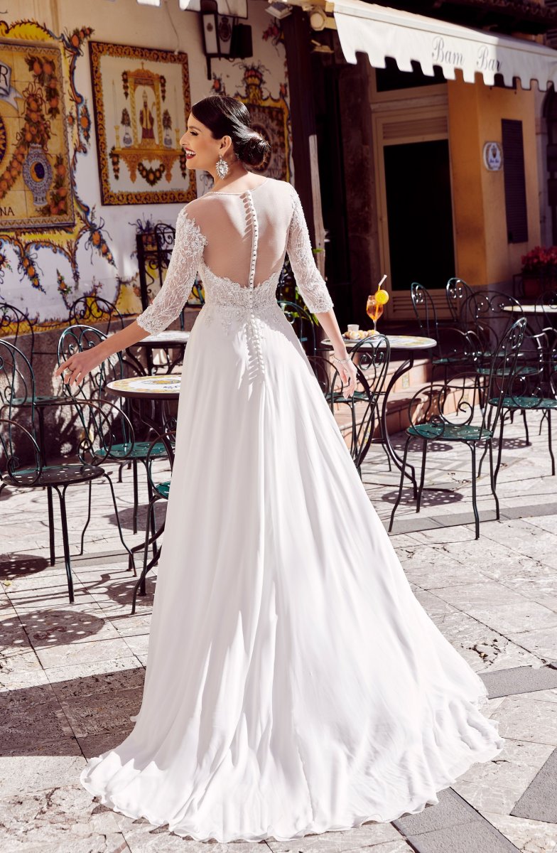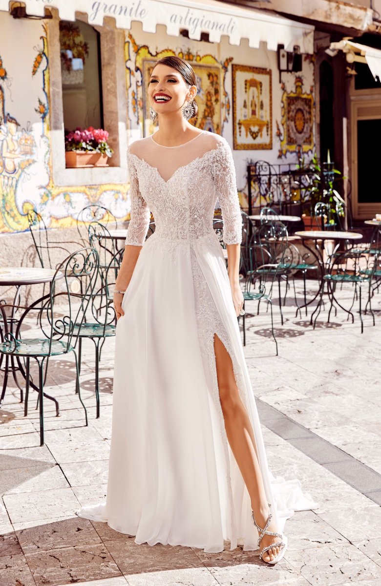 Abito da sposa a collo alto, con uno spacco contemporaneo sulla gamba, perline sotto e una sopragonna trasparente.