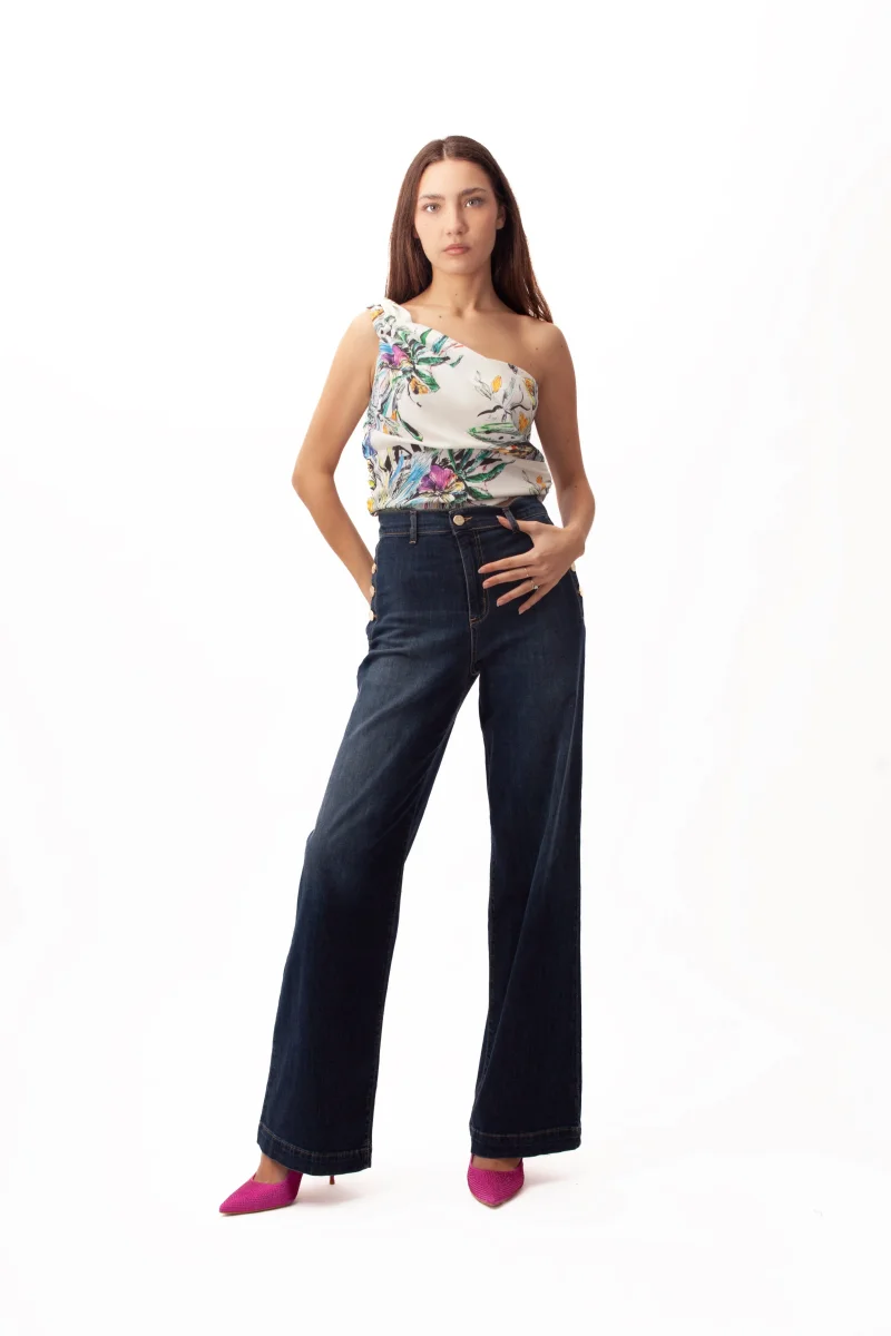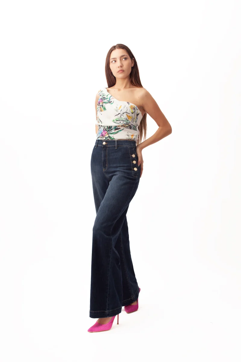 Eleganza fluida e dettagli di stile nel pantalone denim palazzo con bottoni laterali firmato Nexos