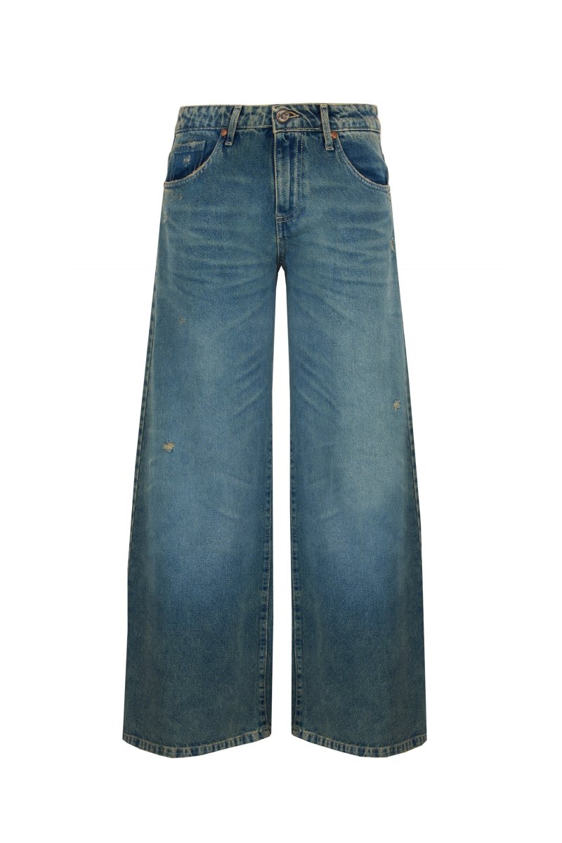 PANTALONE 5 TASCHE DENIM PALAZZO LAVAGGIO SPORCATO CON ROTTURE