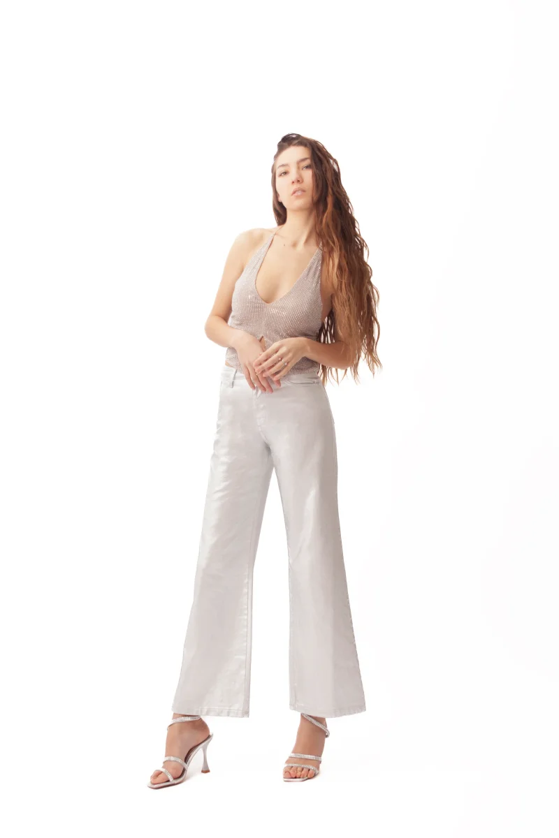 La vestibilitร palazzo dona fluiditร alla figura, mentre le cinque tasche mantengono lโimpostazione funzionale tipica del denim, rivisitata in chiave elegante e contemporanea. Perfetto per eventi, serate speciali o per chi vuole osare anche nei look quotidiani, abbinandolo a capi neutri o a dettagli metallici.