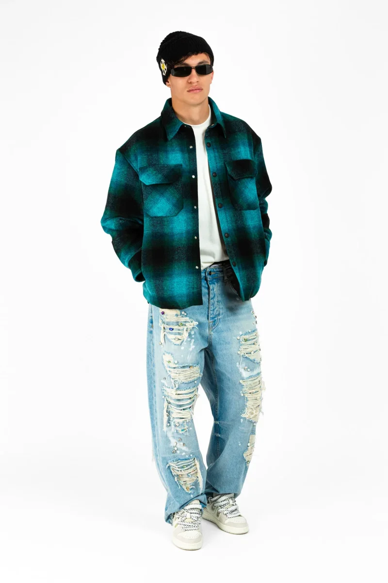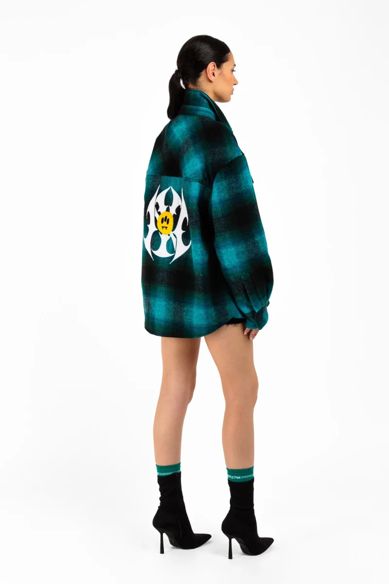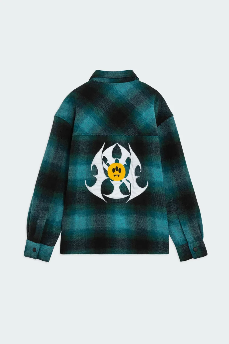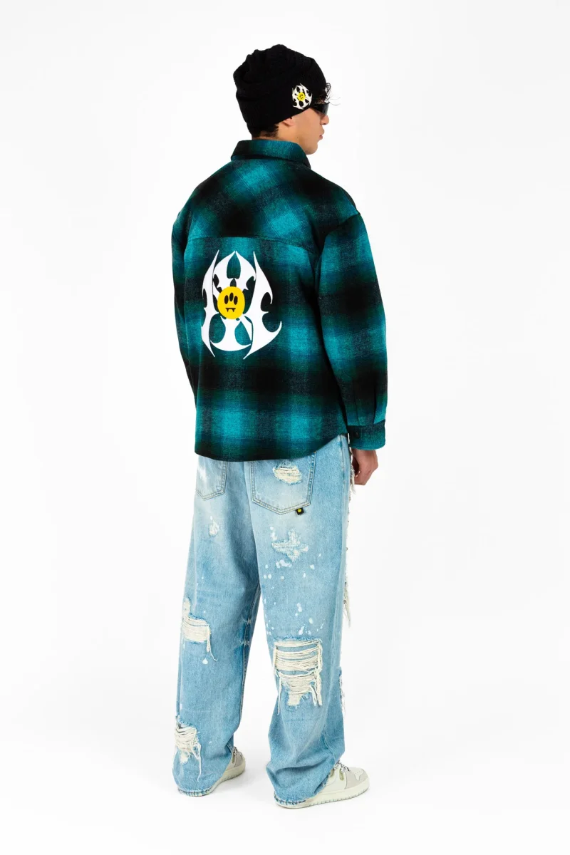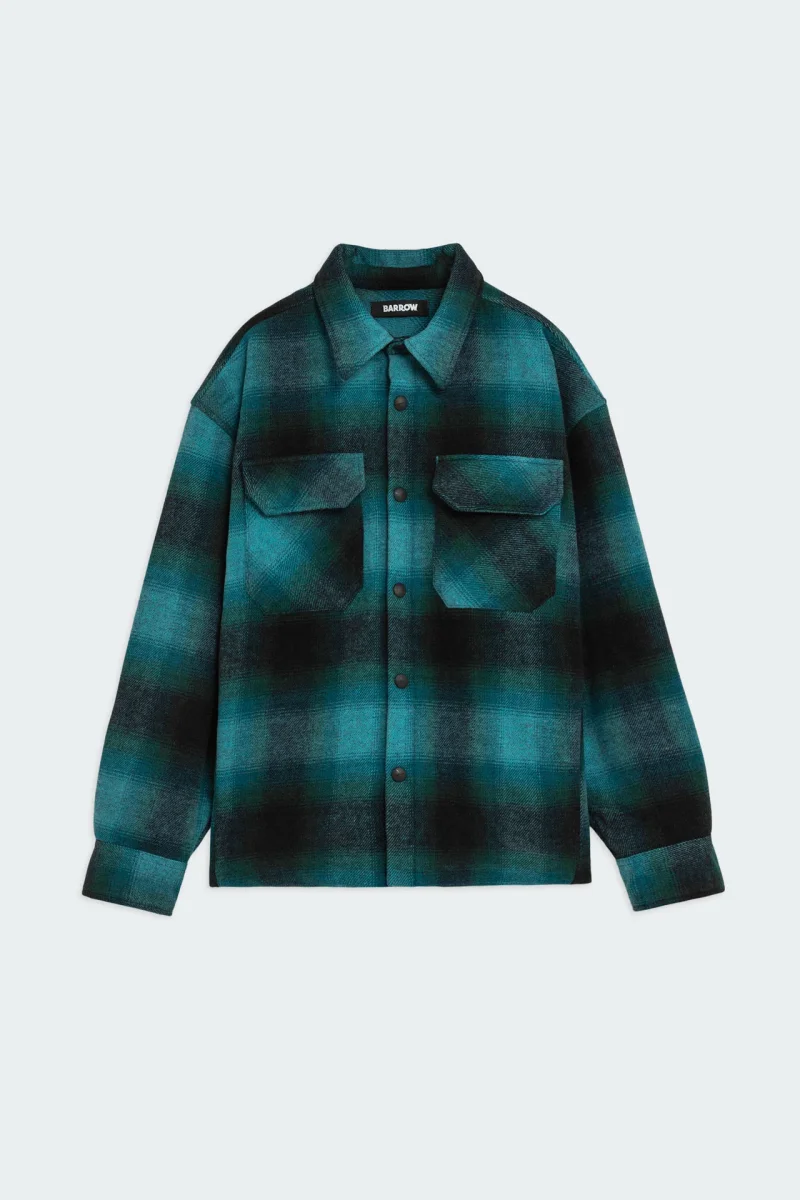 Camicia a maniche lunghe effetto flanella con chiusura a bottoni a pressione. Due tasche applicate con pattina sul petto. Sul retro, maxi stampa con logo iconico Barrow in versione gotica. Dettaglio finale: lavaggio dรฉlavรฉ effetto used.