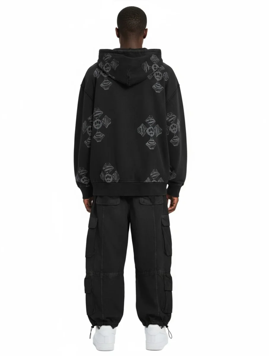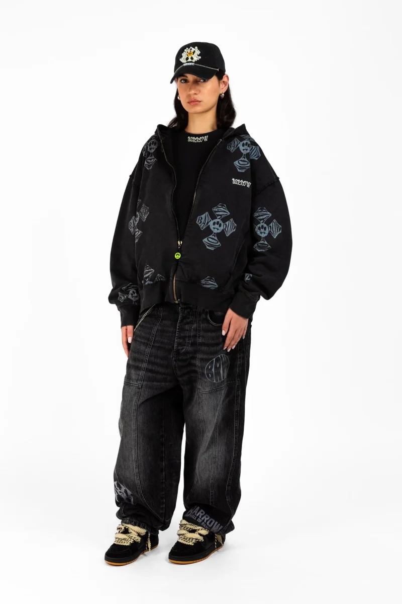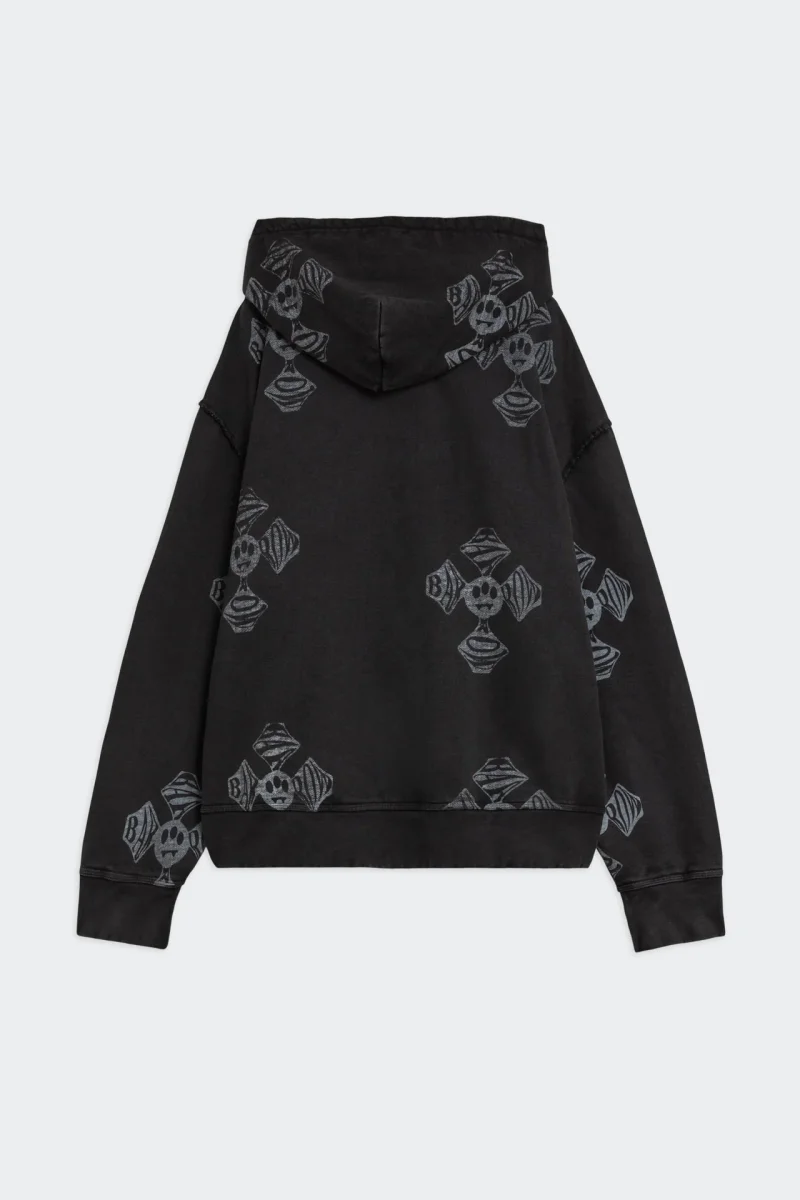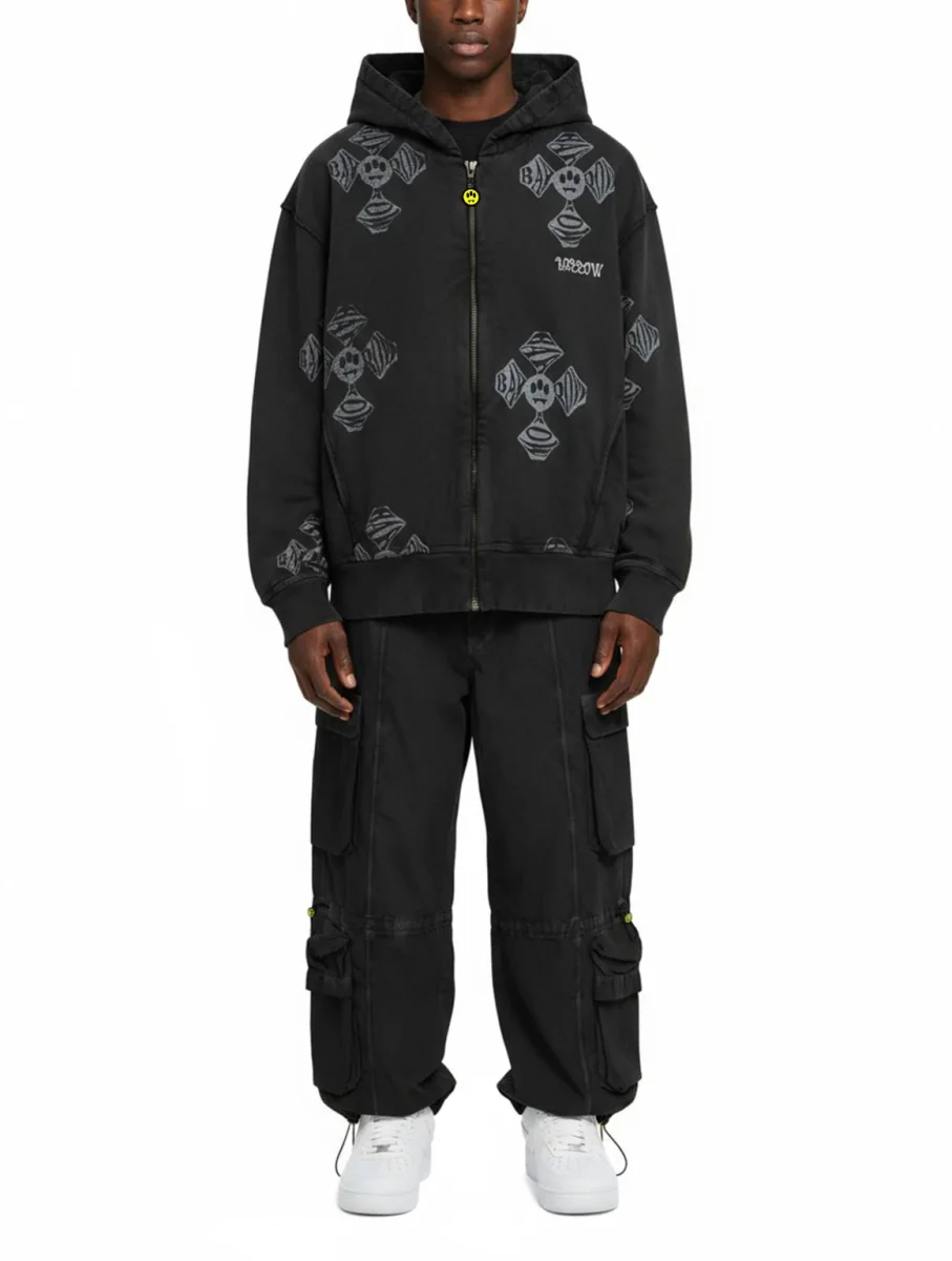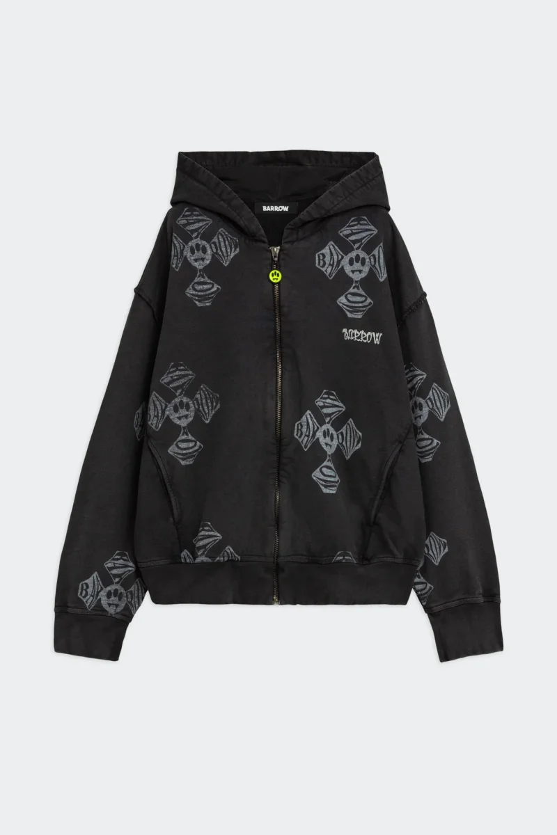 Felpa con cappuccio in 100% cotone dal fit morbido. Fronte con zip centrale e logo Barrow ricamato. Tutta la superficie รจ caratterizzata da croci bianche a contrasto con effetto washed. Label Barrow applicata sul cappuccio.
