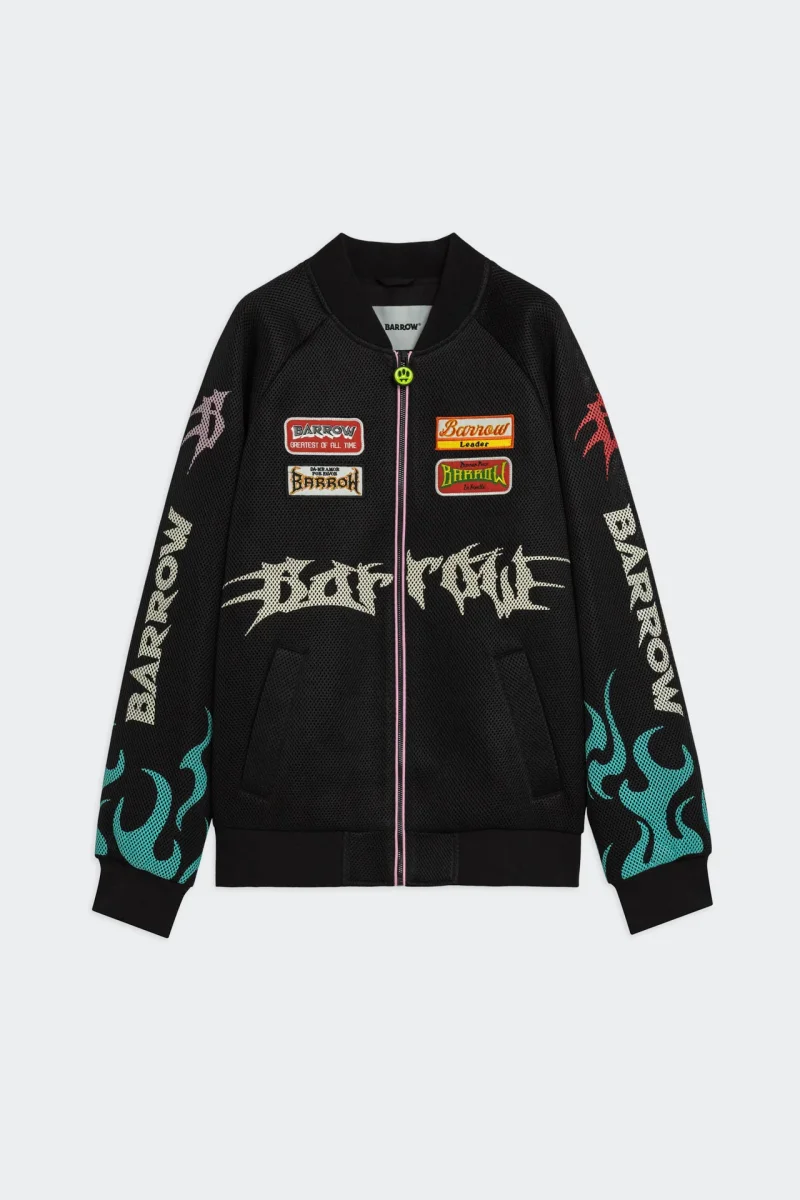 Bomber con zip in mesh 3D, foderato. Vestibilitร comoda. Chiusura frontale con zip, tasche laterali e bordi rifiniti a costine. Stampe grafiche e patch applicate sul davanti e sulle maniche con logo Barrow e dettagli iconici.