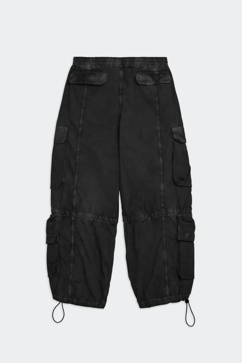 Pantaloni cargo in nylon con effetto washed. Vita elasticizzata con coulisse regolabile e tasche multiple con patta applicate lungo la gamba. Polsini con coulisse personalizzata e patch smile applicata sul retro.