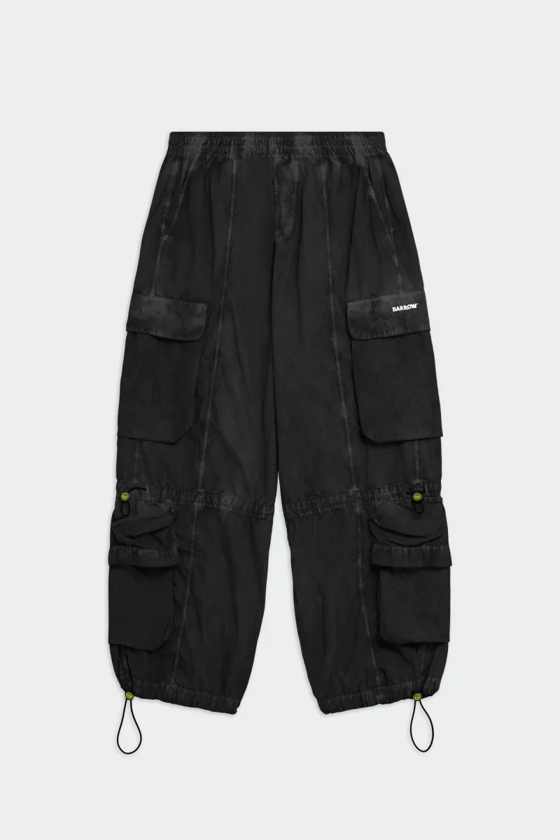 Pantaloni cargo in nylon con effetto washed. Vita elasticizzata con coulisse regolabile e tasche multiple con patta applicate lungo la gamba. Polsini con coulisse personalizzata e patch smile applicata sul retro. 100%POLIAMMIDE