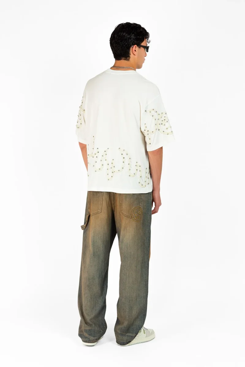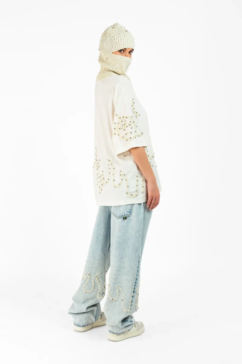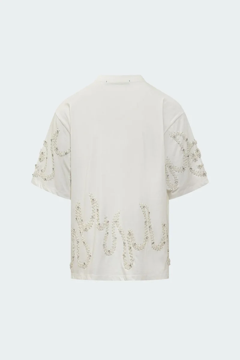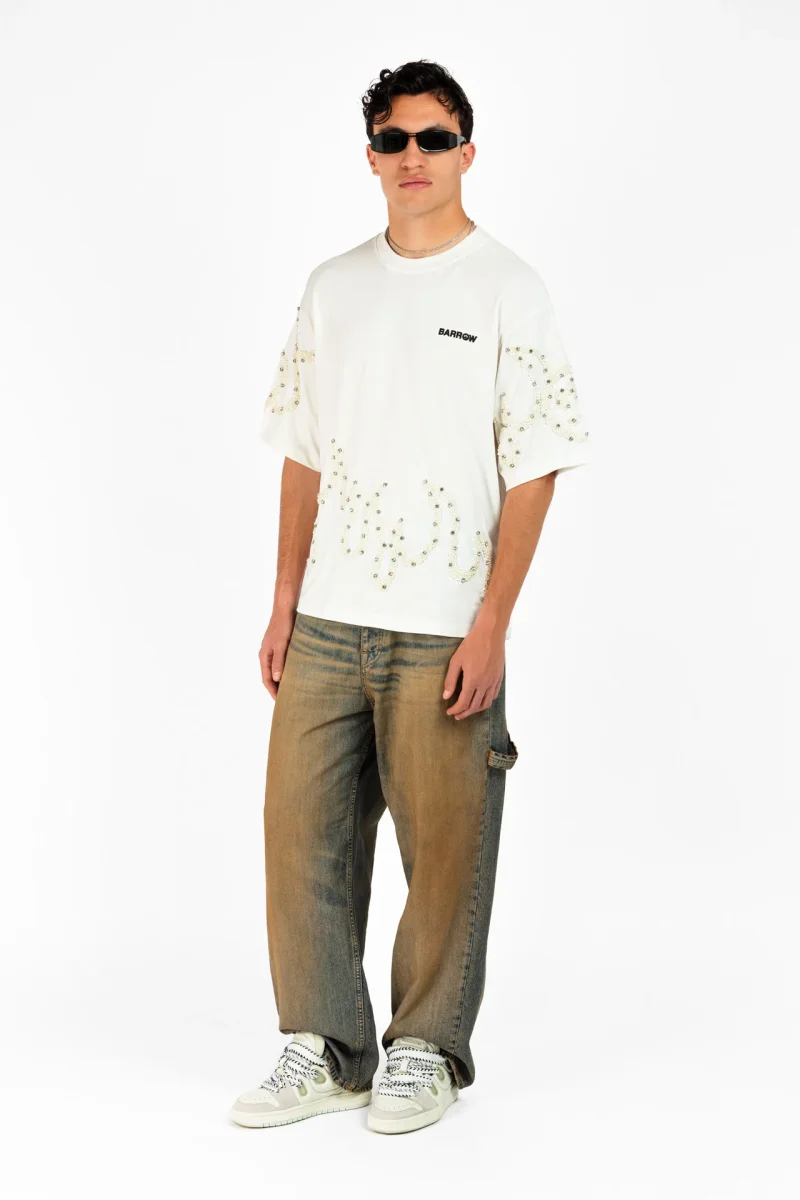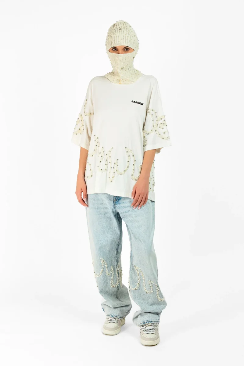 T-shirt in 100% cotone dal fit morbido con stampa Barrow sul fronte. La t-shirt รจ arricchita da applicazioni in perla sulle maniche e sul fondo. COTONE 100% MADE IN INDIA