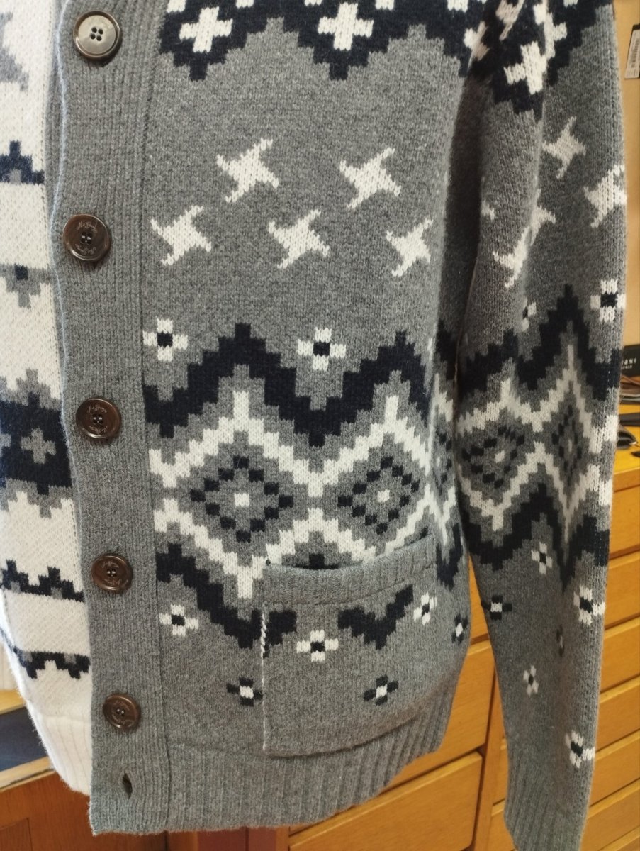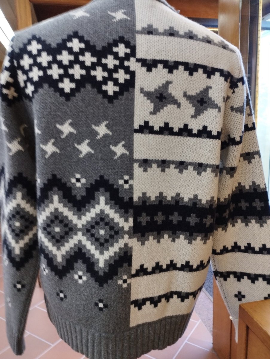 Bomber in lana e cashmere a due fili, con lavorazione a “Jacquard”. Due tasche esterne, chiusura con bottoni. Misure in cm. : Taglia 50 spalle 42, vita 53, manica 64, lunghezza 65 Taglia 52 spalle 43, vita 54, manica 65, lunghezza 66 Taglia 54 spalle 44,vita 55, manica 66, lunghezza 67