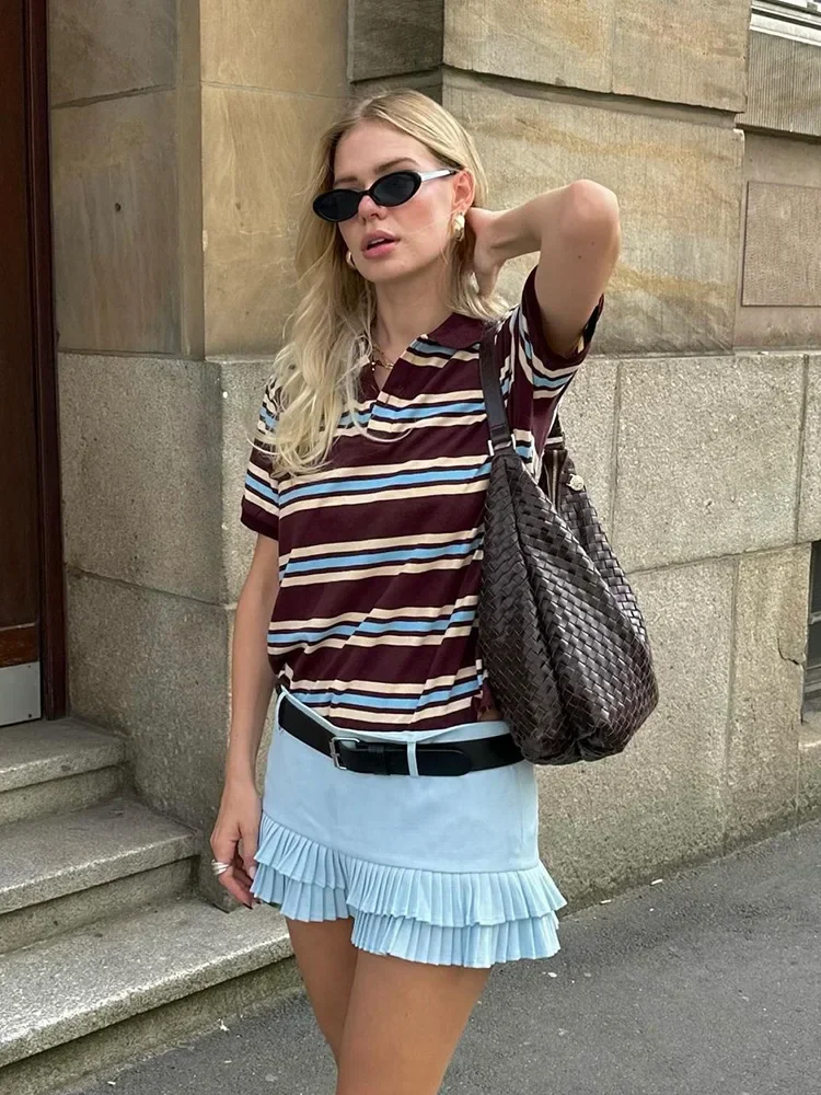 Burgundy Striped Casual Women T-shirt