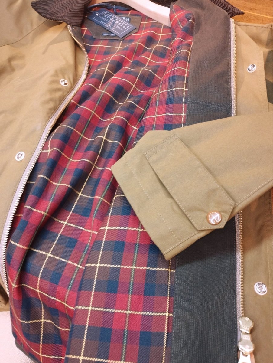 “Rain Caban”, modello iconico dell’azienda, realizzato in cotone paraffinato.