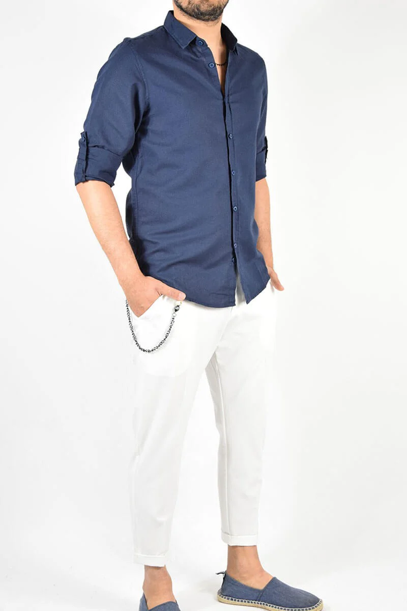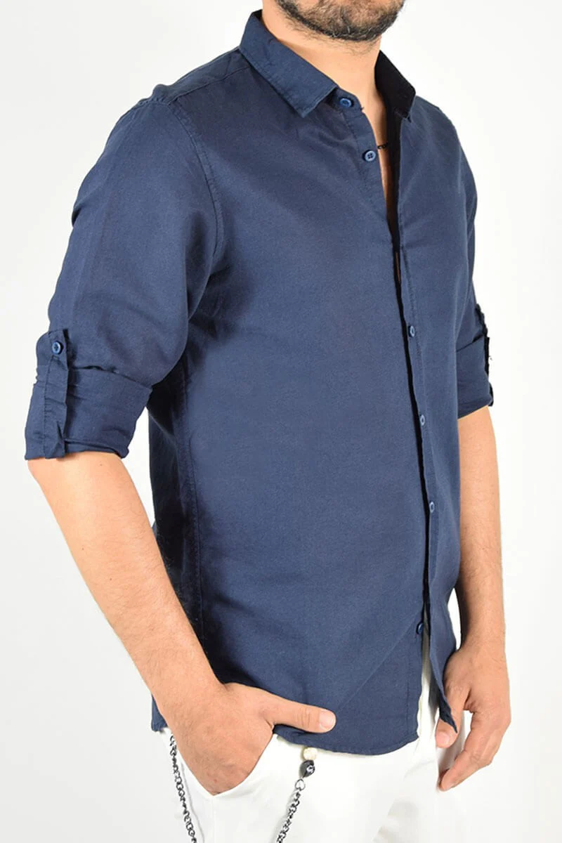 CAMICIA IN LINO COLORE: Blu COMPOSIZIONE: 80% Lino 20% Cotone ALTEZZA MODELLO: 185 cm TAGLIA L