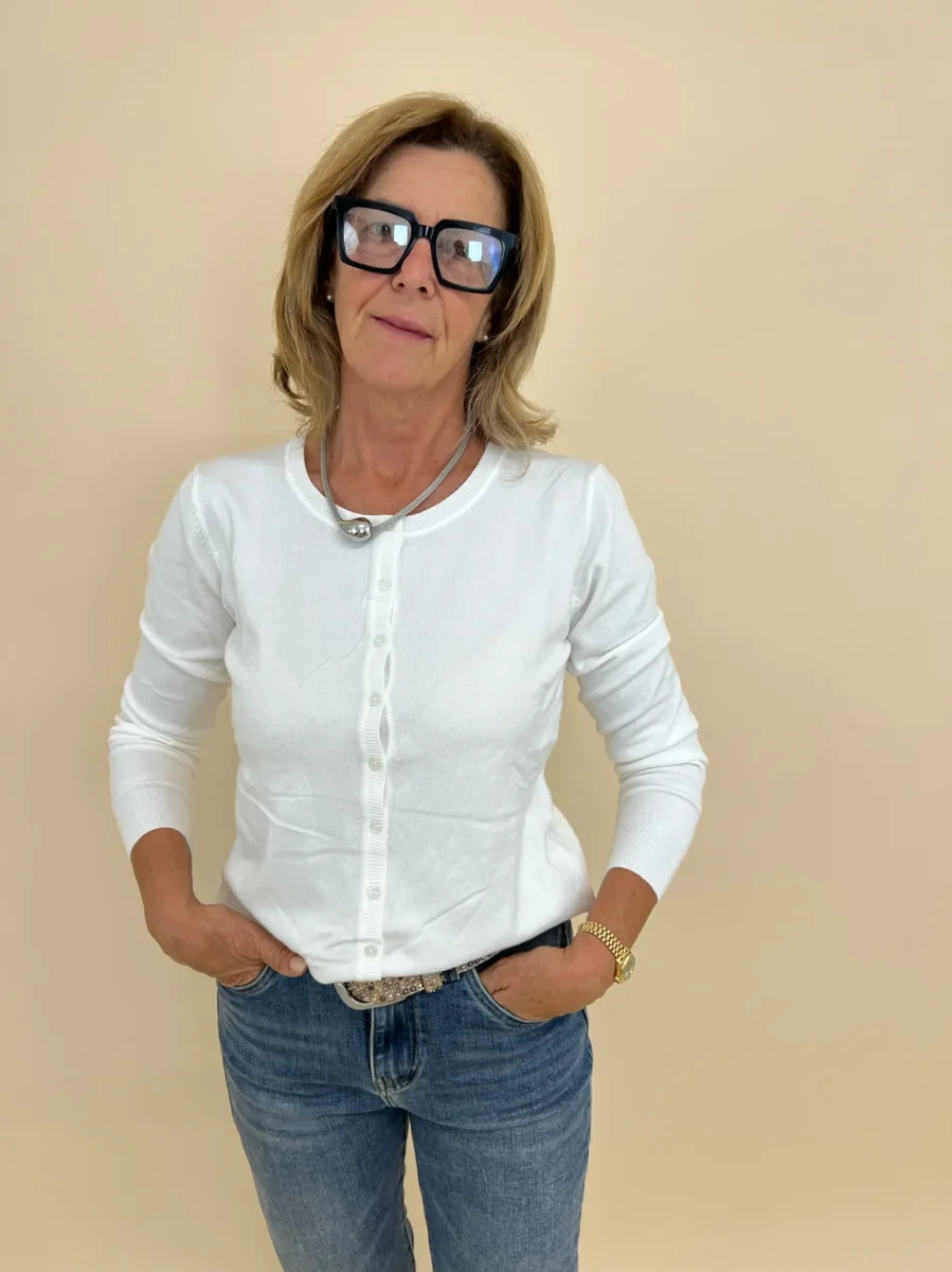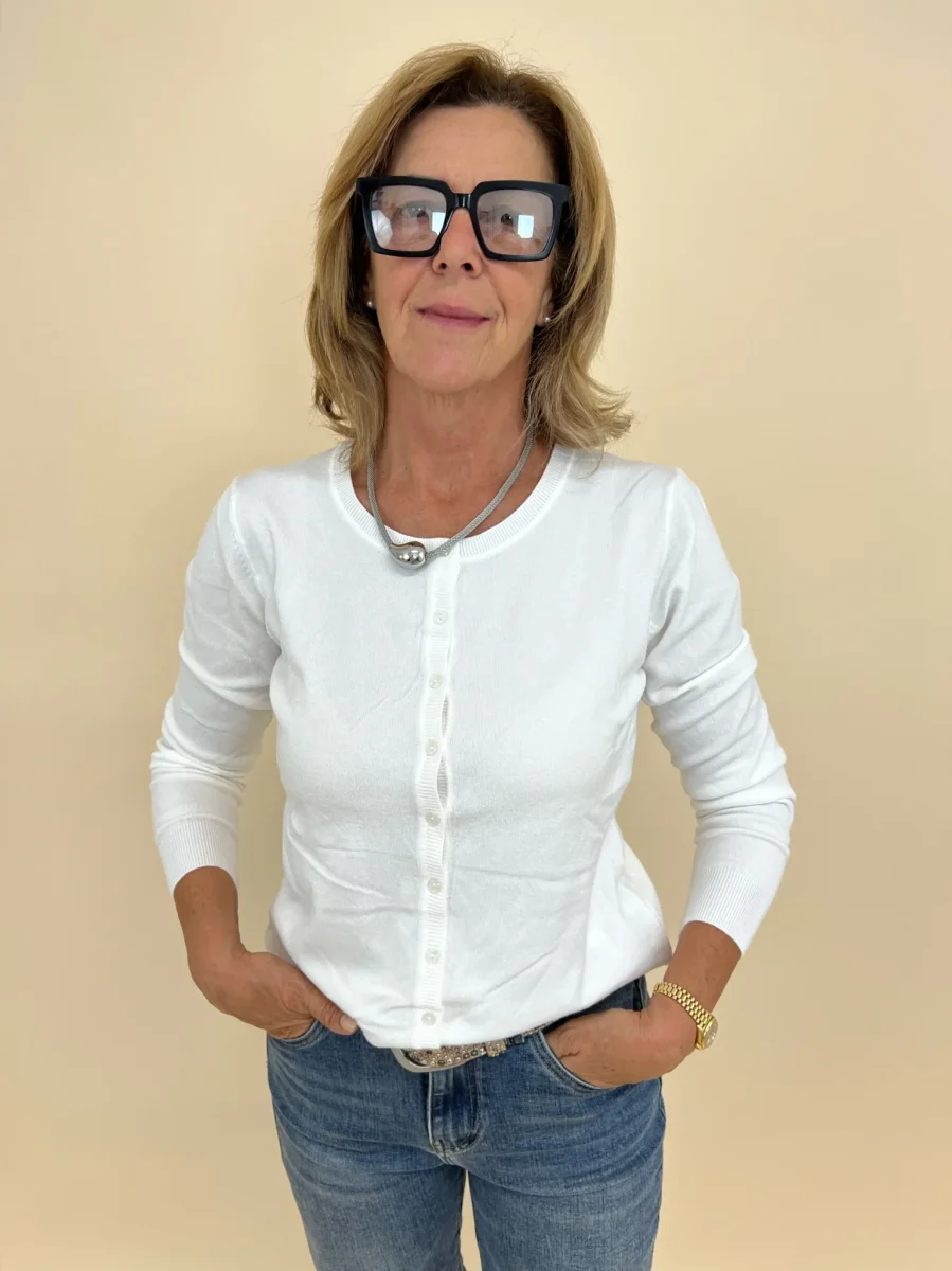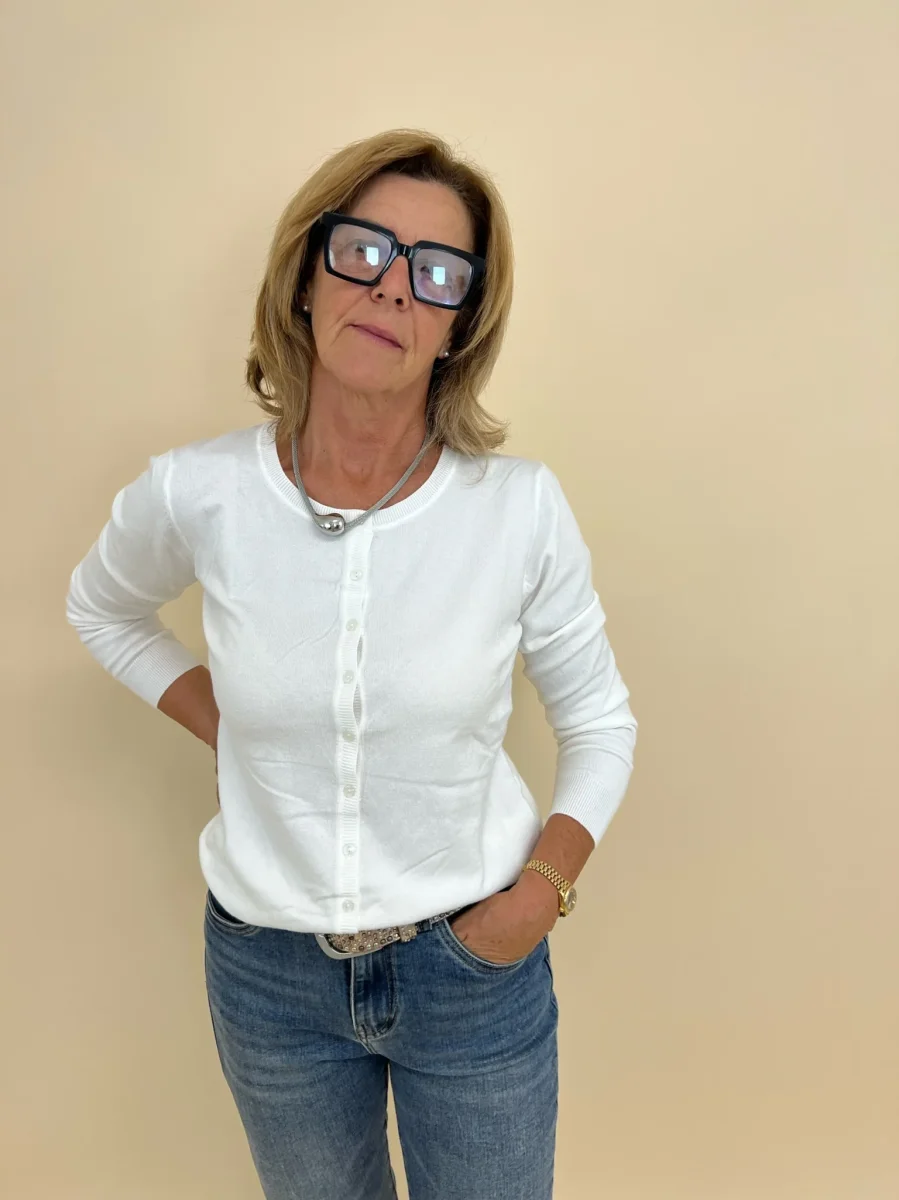 Cardigan con bottoncini a girocollo vestibilitร morbida da una 44 fino ad una 50 Composizione: 50% viscosa 28% poliestere 22% poliamide