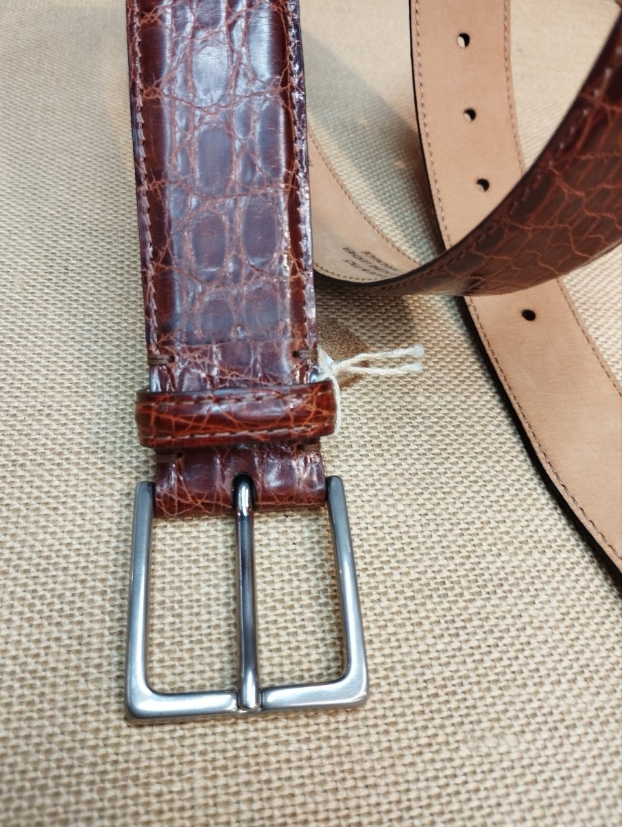 Cintura in fianco di coccodrillo, altezza cm.3,5. Fodera in Nabuk. Lunghezza al foro centrale cm.95 Colore Marrone bruciato.