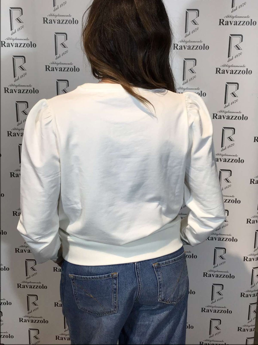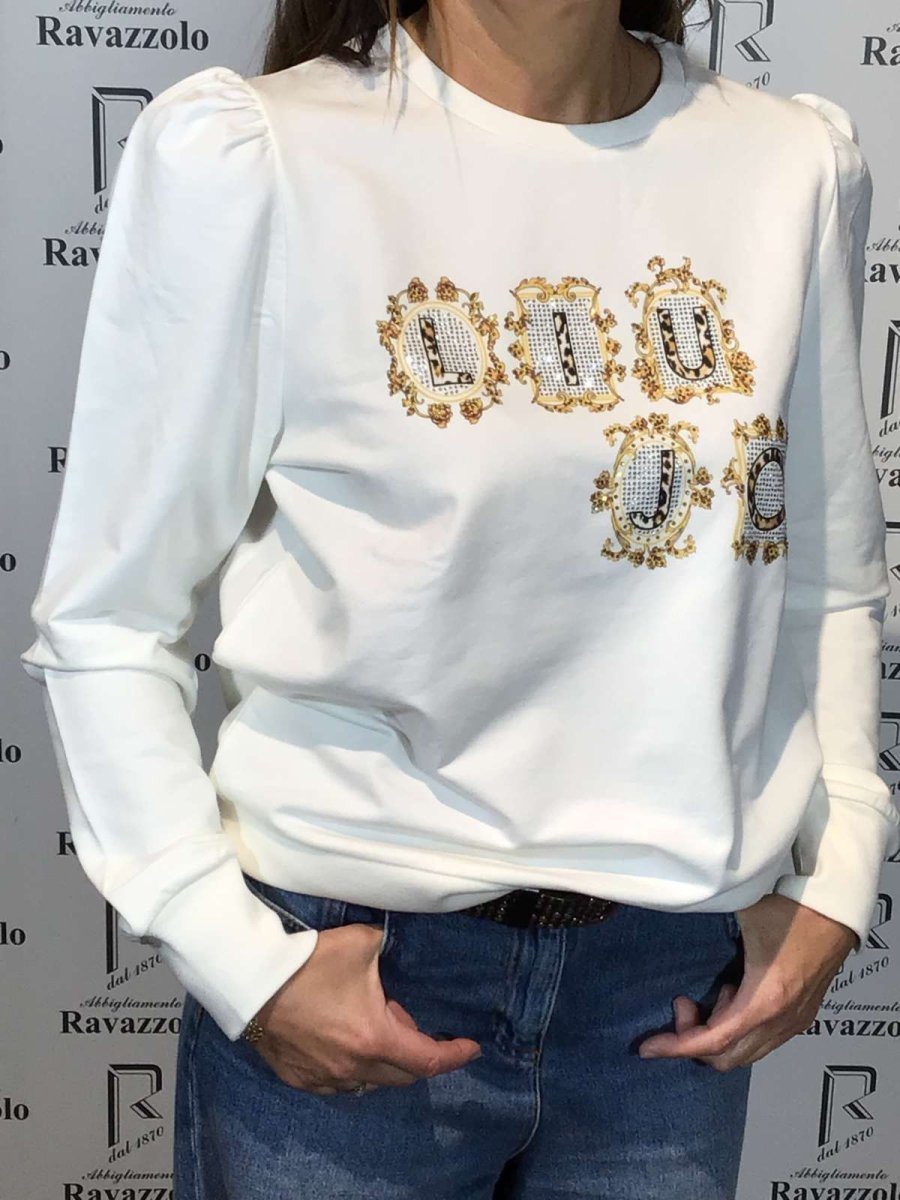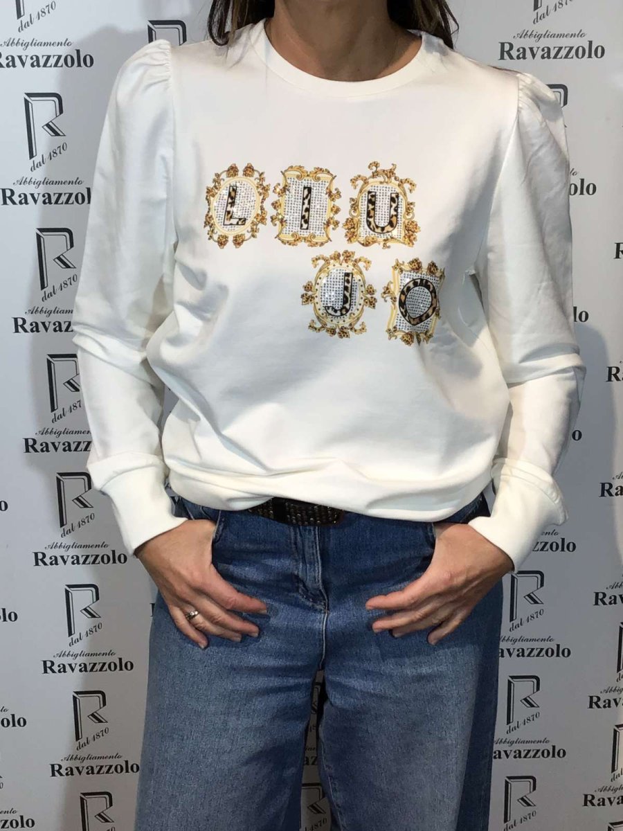 LIU JO mod. WF2331-TF0090 col. R9558 bianco, FELPA GIROCOLLO logoย VERSACE styleย “LIU JO” brillantinato, particolare spalla a sbuffo, vestibilitร regular fit.