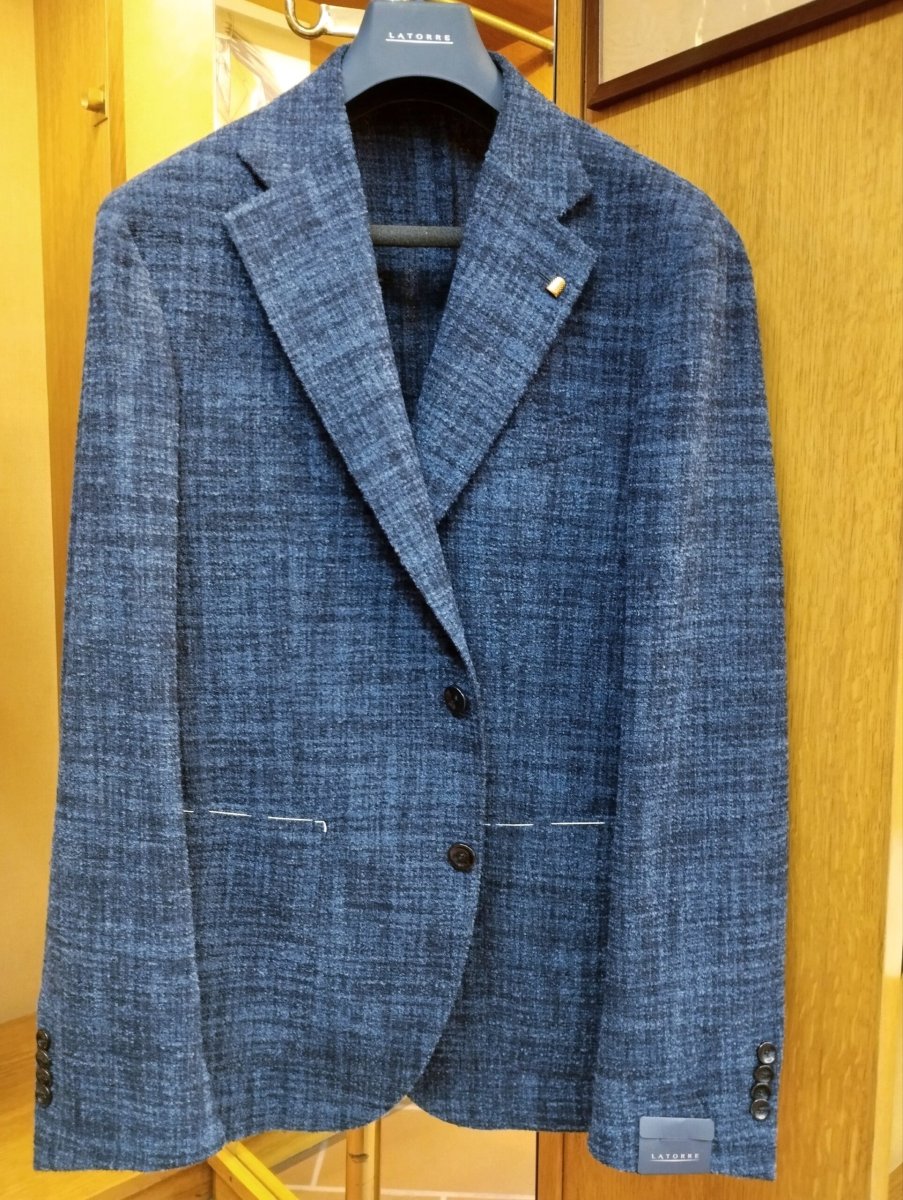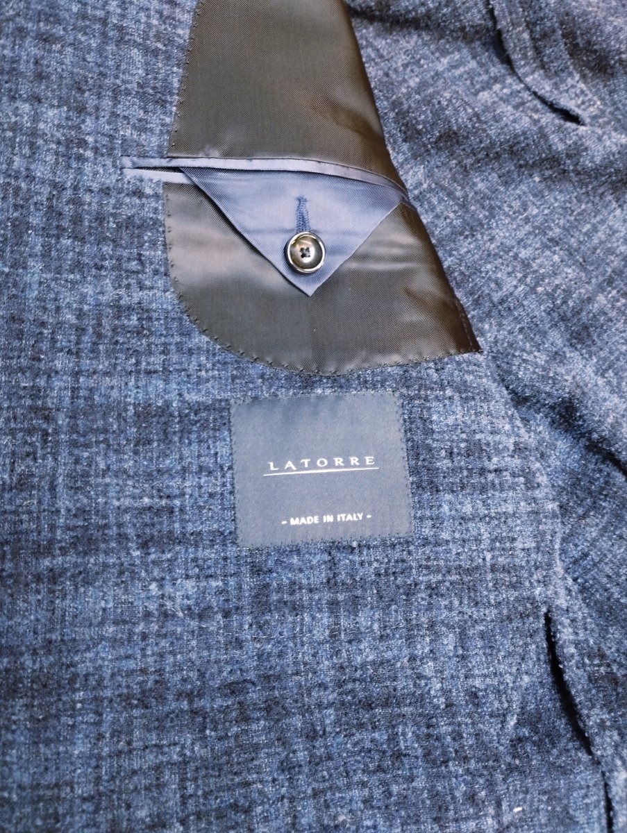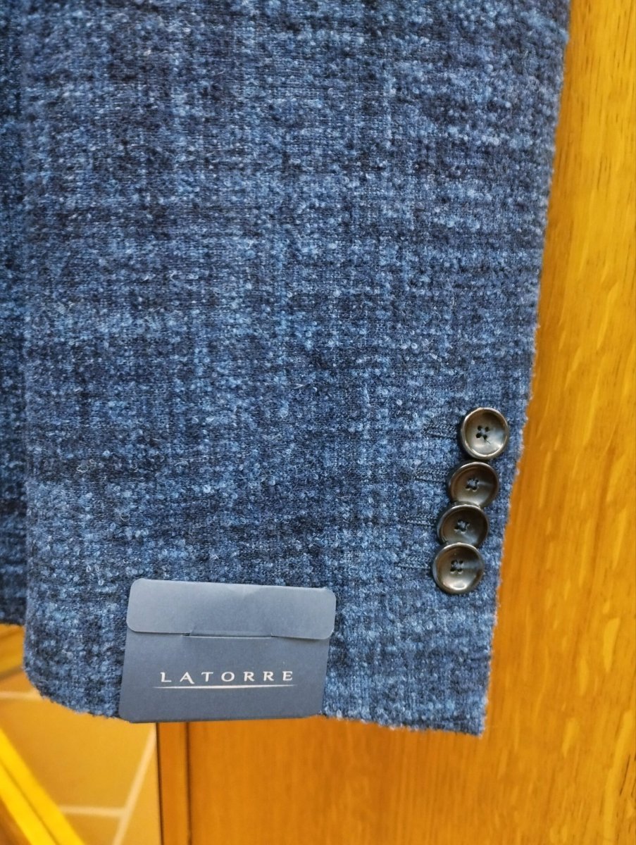 Giacca sfoderata, monopetto a due bottoni, tasche a toppa e spacchi laterali. Tessuto : 53% Alpaca 33% Lana 14% Poliammide Misure: Latorre