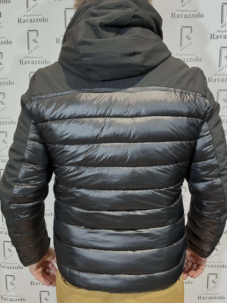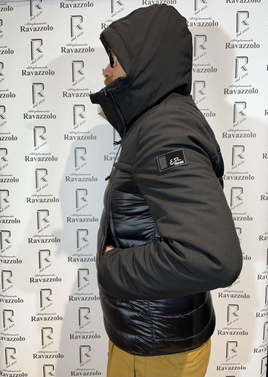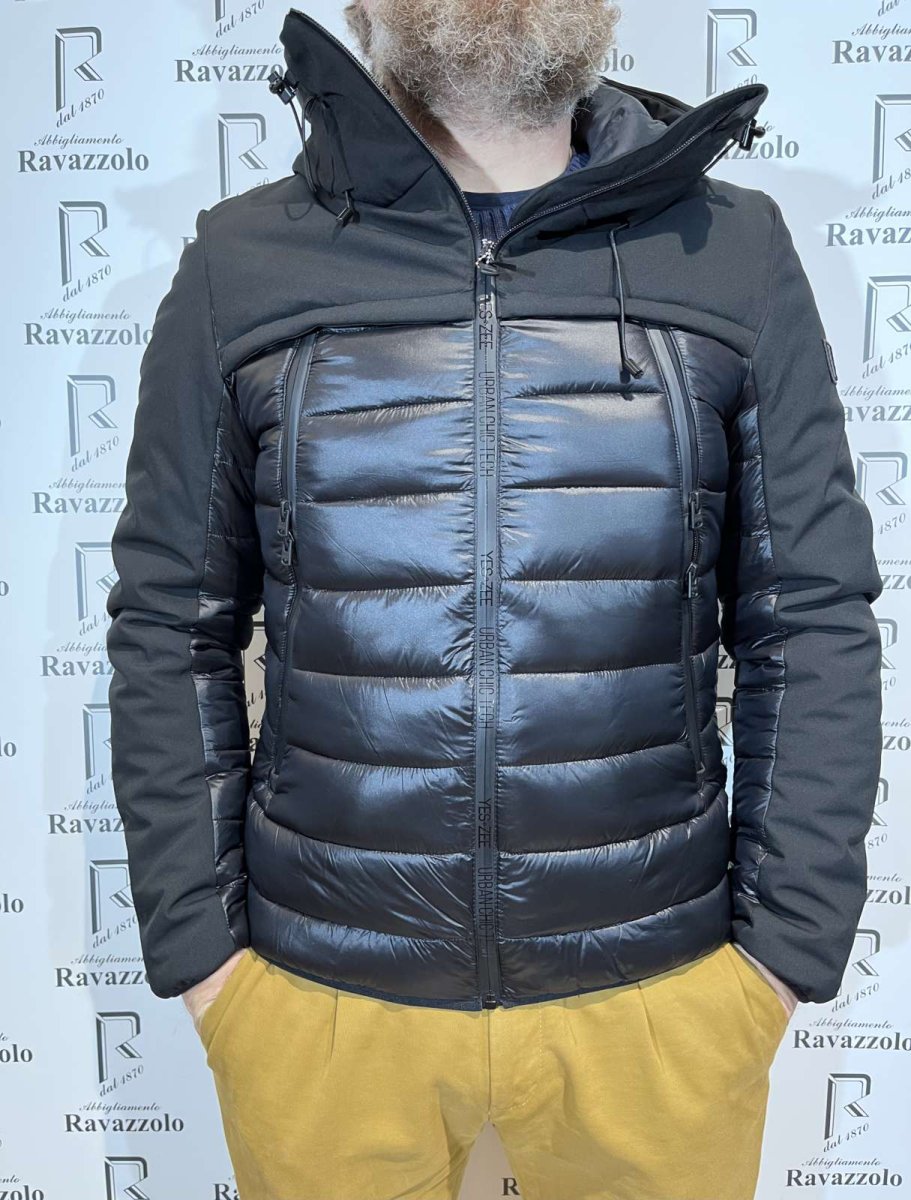 YES-ZEE mod. J864-Q700 col. 801/NERO, giubbino in tessuto accoppiato SOFT SHELL e nylon, garantisce comfort in ogni condizione metereologica, imbottito in 10% VERA PIUMA e 90% poliestere, con 4 ampie e comode tasche con chiusura a zip termosaldata, cappuccio fisso e utilissimo spallaccio interno per un uso alternativo.
