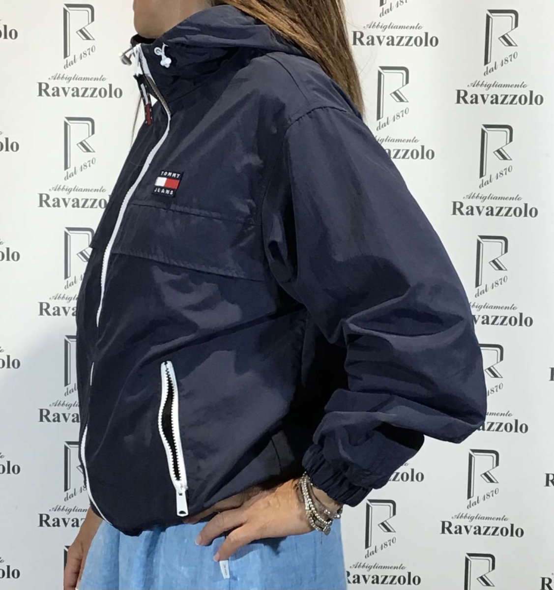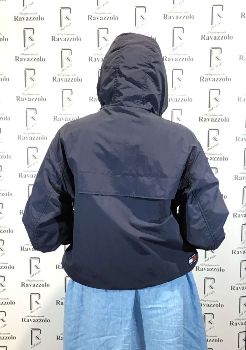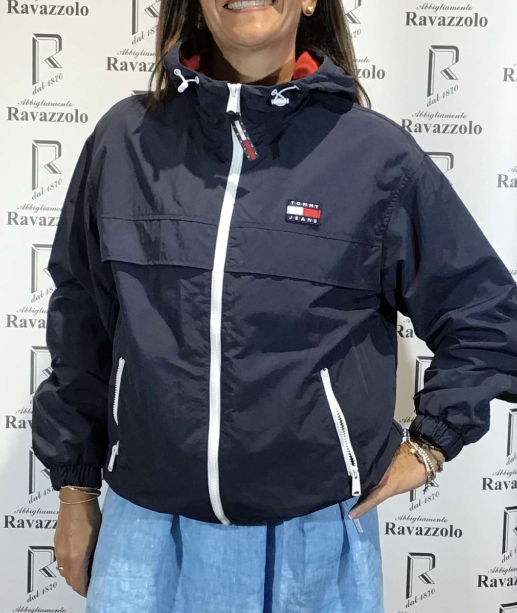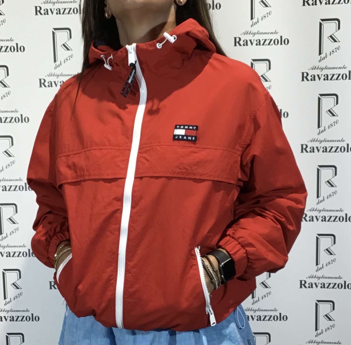 TOMMY JEANS DW12613 ,giubbino donna 100% NYLON RECYCLED, zip in contrasto,con coulisse sul cappuccio e fondo vestibilitร over size.