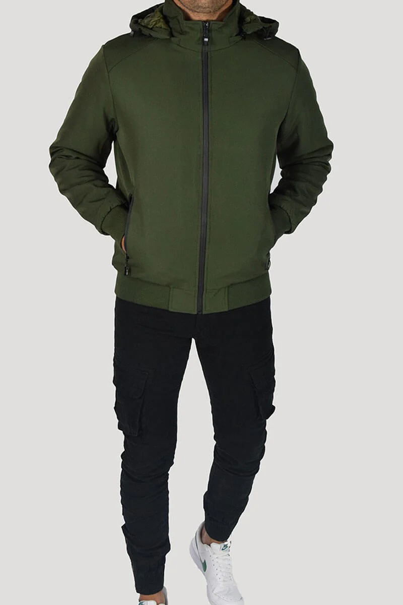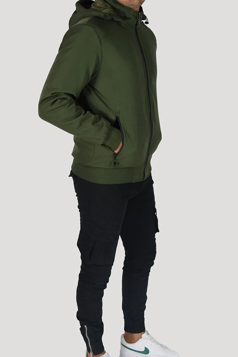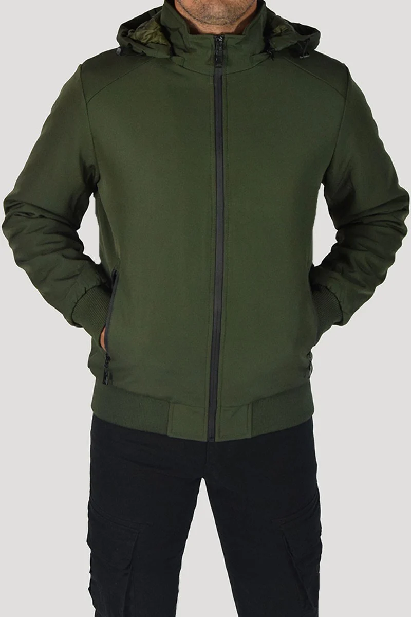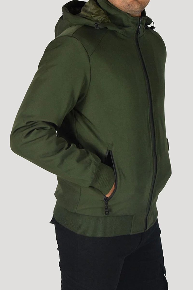 GIUBBOTTO CON CAPPUCCIO COLORE: Verde COMPOSIZIONE: 95% Poly 5% Elastan RIFERIMENTO TAGLIA: Il modello in foto รจ alto 1,80 per 78kg e indossa la taglia M