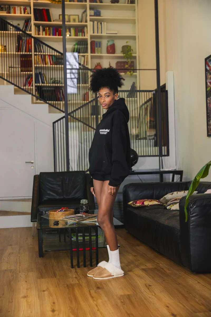 Hoodie Boxy Fit Cappuccio doppio strato a cuciture coperte Tasca a marsupio con bartack rinforzato Polsini elasticizzati Stampa DTF Cotton/Poly Blend – 420gsm Made in italy Modella 175 cm, taglia M Lavare e stirare al rovescio, max 30ยฐC Unisex product