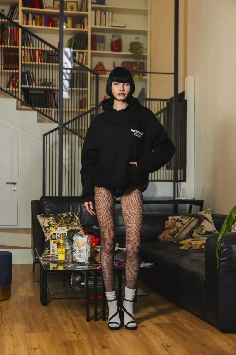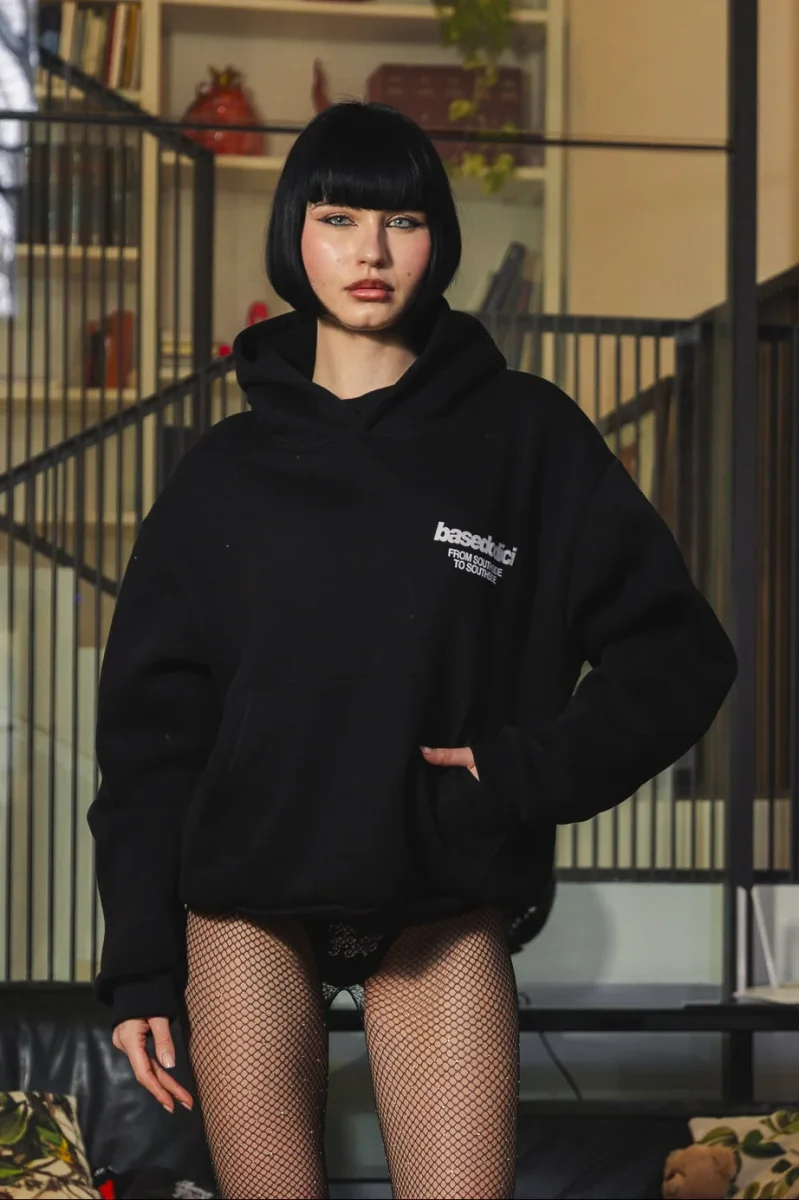Hoodie Boxy Fit Cappuccio doppio strato a cuciture coperte Tasca a marsupio con bartack rinforzato Polsini elasticizzati Stampa DTF Cotton/Poly Blend – 420gsm Made in italy Modello 183 cm, taglia L Modella 175 cm, taglia M Lavare e stirare al rovescio, max 30ยฐC Unisex product