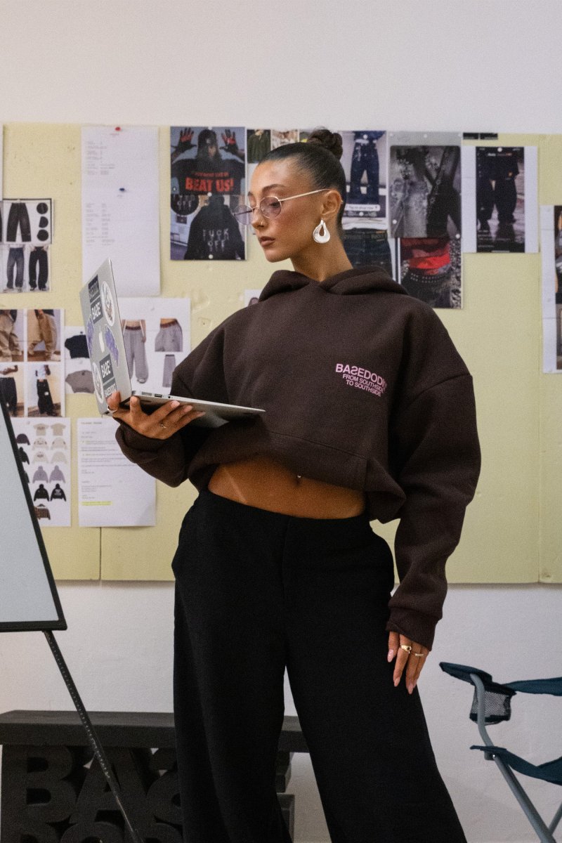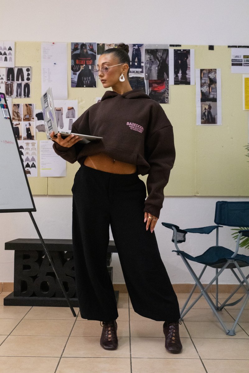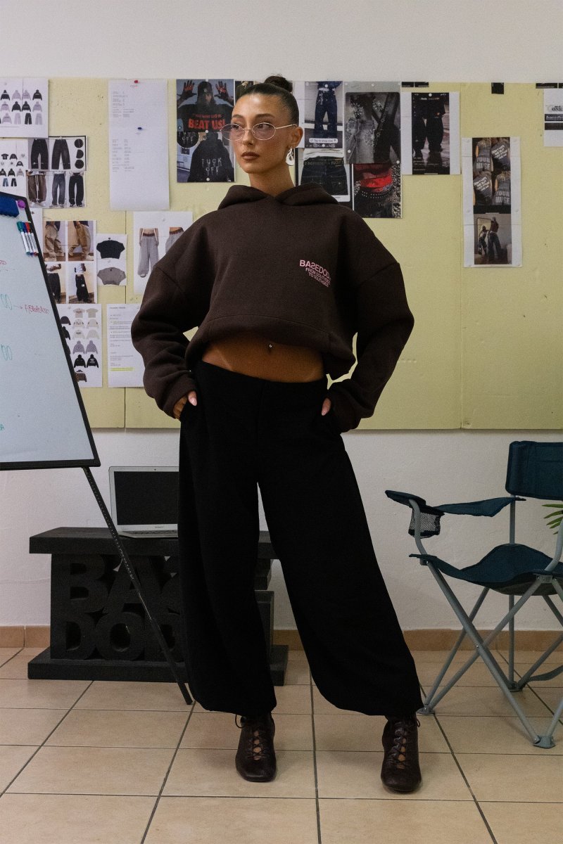 Hoodie Boxy Fit Cappuccio doppio strato a cuciture coperte Tasca a marsupio con bartack rinforzato Polsini e vita elasticizzati Stampa termo-applicata DTF Cotton/Poly Blend – 420gsm Made in italy Modello 182 cm, taglia L Lavare e stirare al rovescio, max 30ยฐC Unisex product