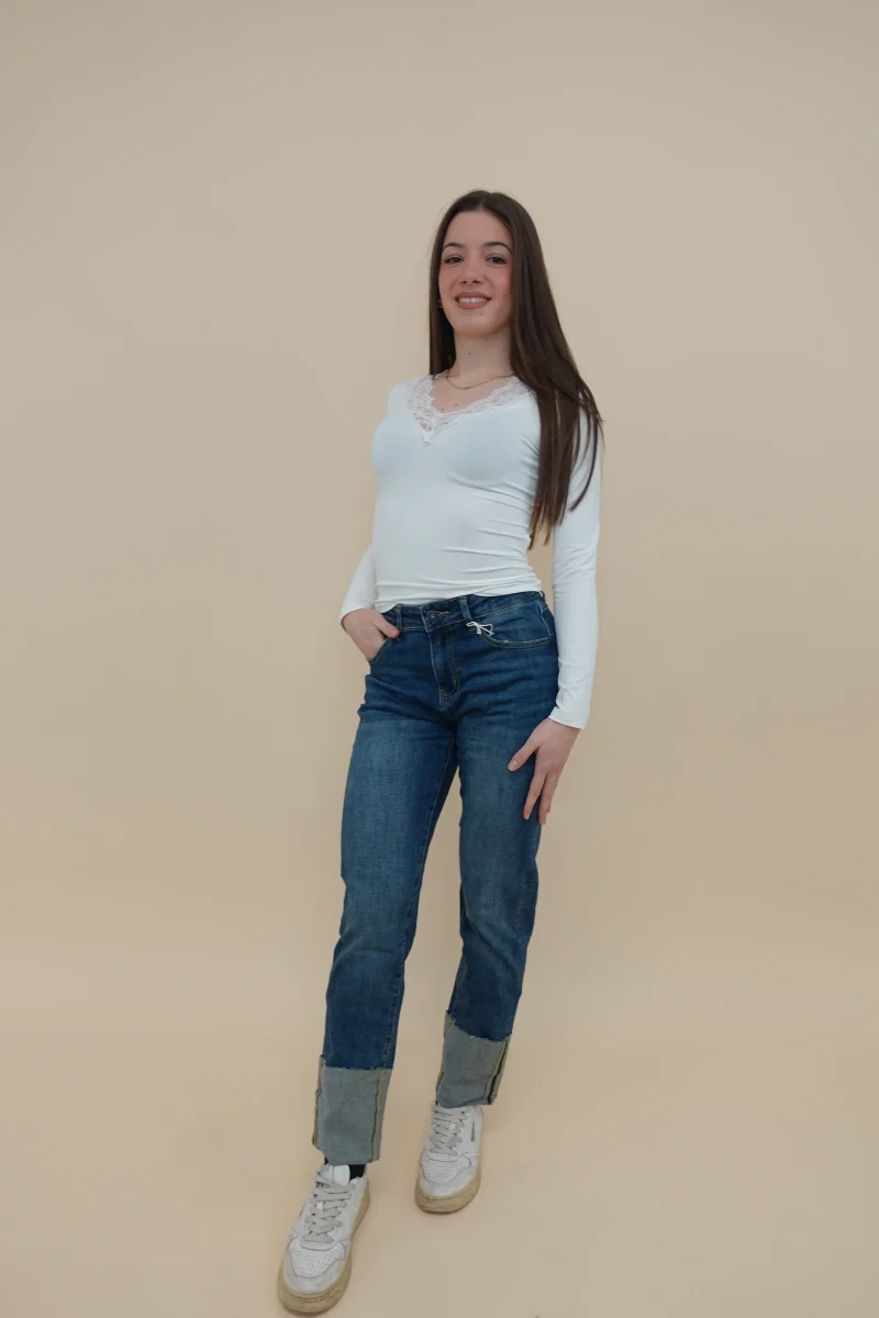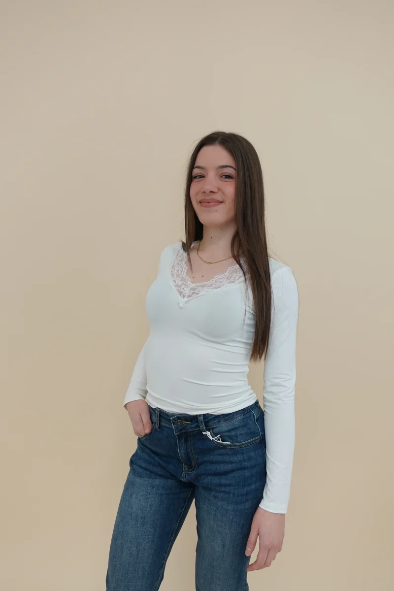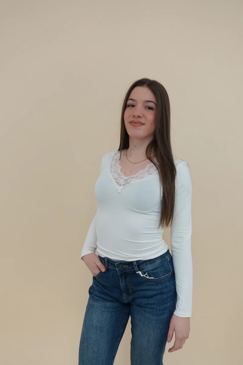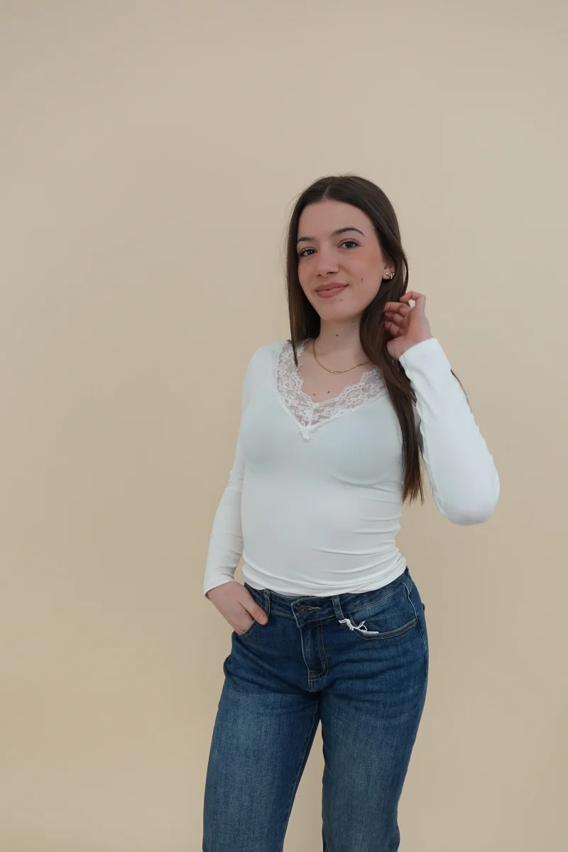 Maglia elasticizzata con scollp a V e pizzo sul davanti