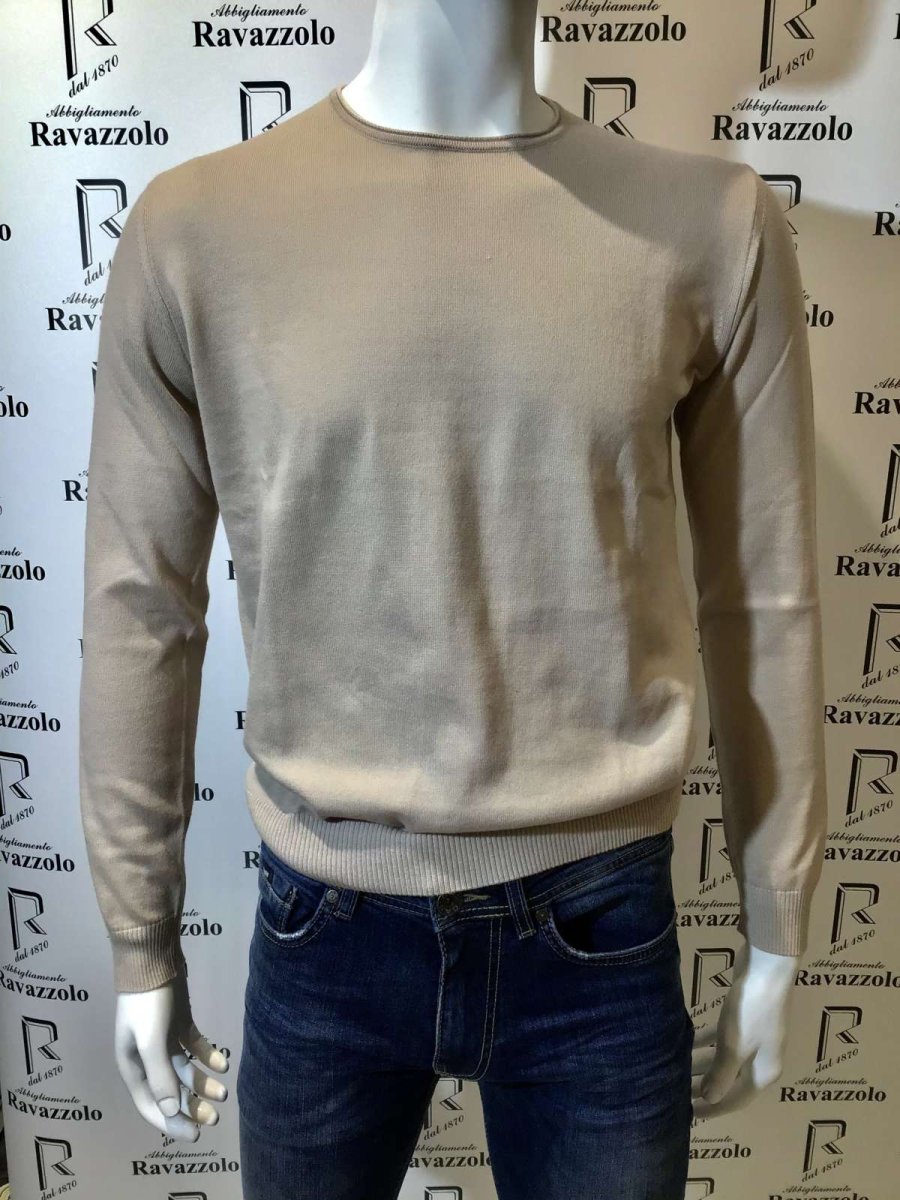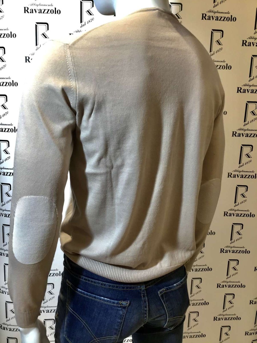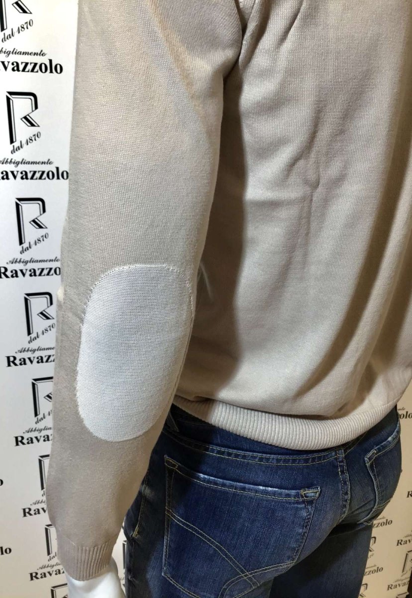 FERRANTE mod. 37U24107 col. 201 BEIGE, maglia 100% cotone, filato e manifattura produzione Italia su Italia, particolare effetto a taglio vivo su profilo giro collo eย toppe rimagliate a contrasto, vestibilitร regolare.