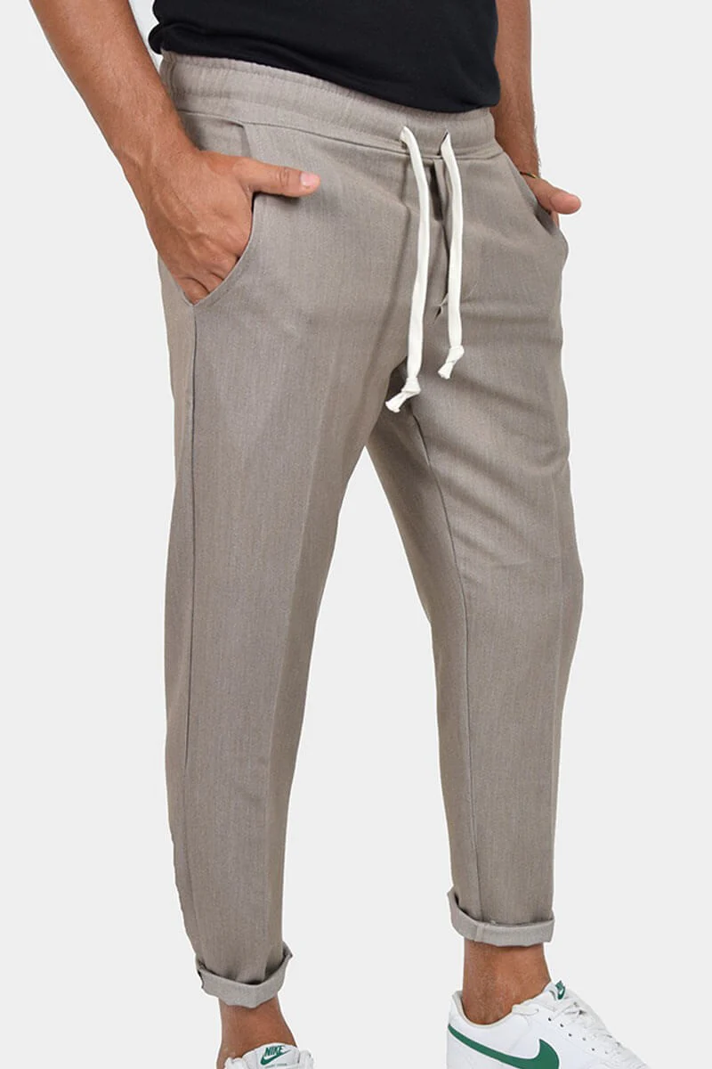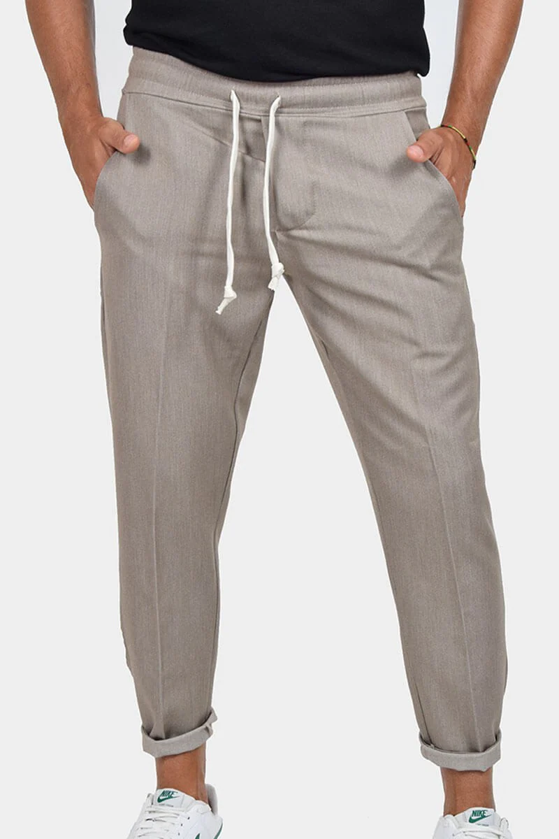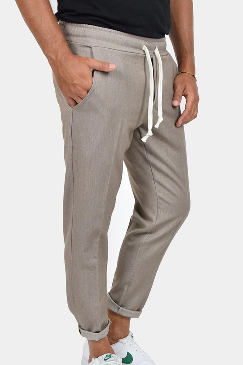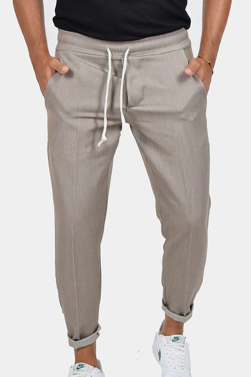 PANTALONI CON LACCIO IN VITA COLORE: Tortora COMPOSIZIONE: 78% Poly 18% Viscosa 4% Elastico RIFERIMENTO TAGLIA: Il modello in foto รจ alto 1,80 per 78kg e indossa la taglia M MADE IN ITALY