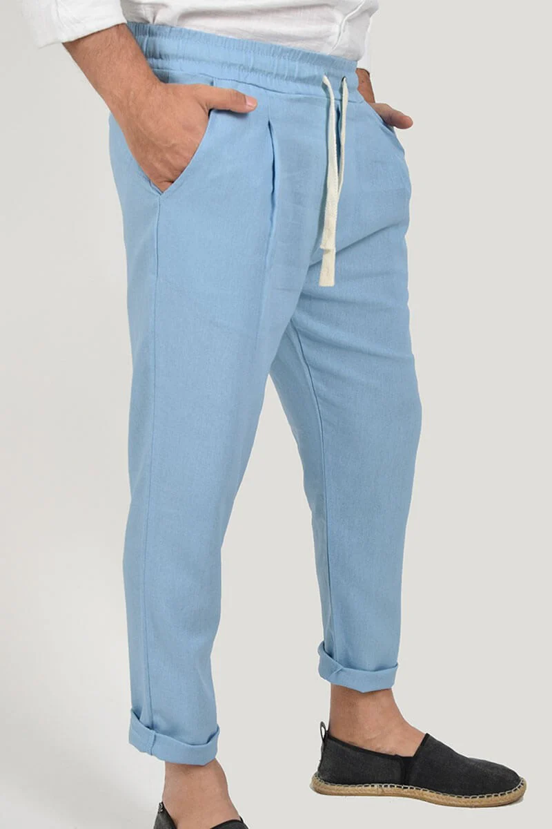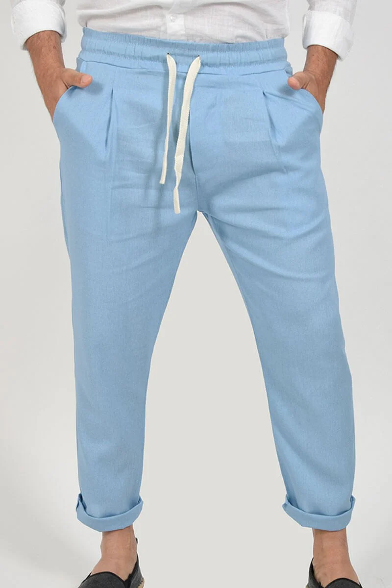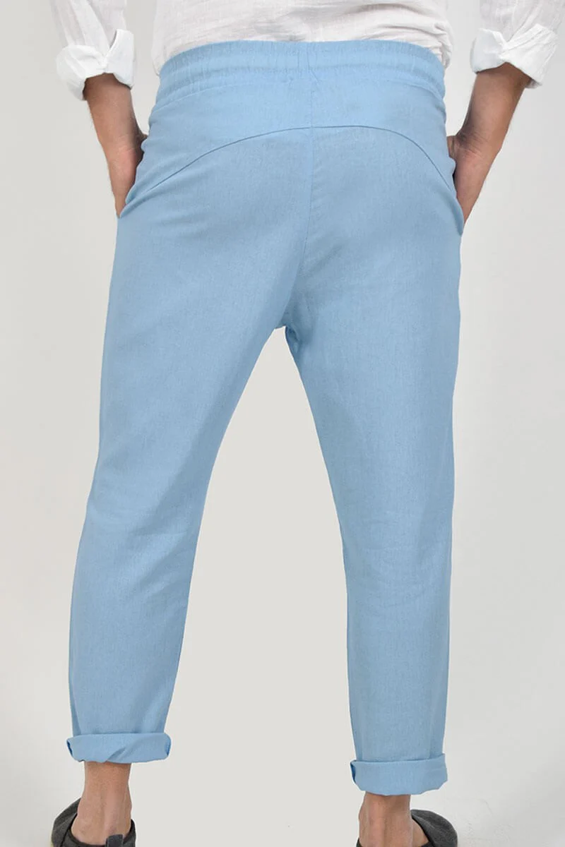 PANTALONI IN LINO CON LACCIO IN VITA COLORE: Celeste COMPOSIZIONE: 55% Lino 45% Viscosa RIFERIMENTO TAGLIA: Il modello in foto รจ alto 1,80 per 78kg e indossa la taglia M MADE IN ITALY