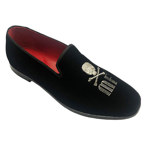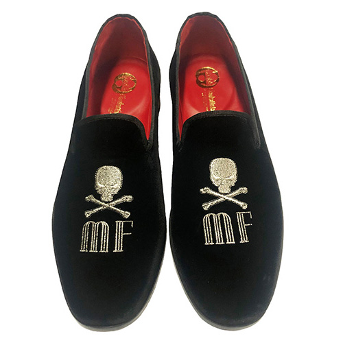 Pantofole slippers con teschio e iniziali personalizzate, ย in velluto, foderate in pelle, scarpe realizzate su ordinazione in qualsiasi colore della cartella, opzione personalizzabile. Materiali: tomaia in velluto, fodera in pelle, plantare in pelle con poron per un miglior confort suola in cuoio costruito e cucita blake.. Disponibile dal 39 al 46 calzata comoda Italiana. Calzature realizzate su ordinazione in laboratorio artigianale con pellami e materiali di prima scelta, tutto made in Italy. Dal momento dell’ordine specificando la taglia e colore, abbiamo bisogno di un massimo di 10 giorni lavorativi per la realizzazione. Su richiesta si puรฒ avere la cintura nello stesso pellame con l’aggiunta di 35,00 euro. Lavorazione rigorosamente artigiana! I nostri prodotti sono tutti realizzati a mano. Per altre taglie chiedere a [email protected]