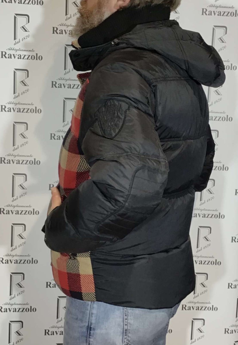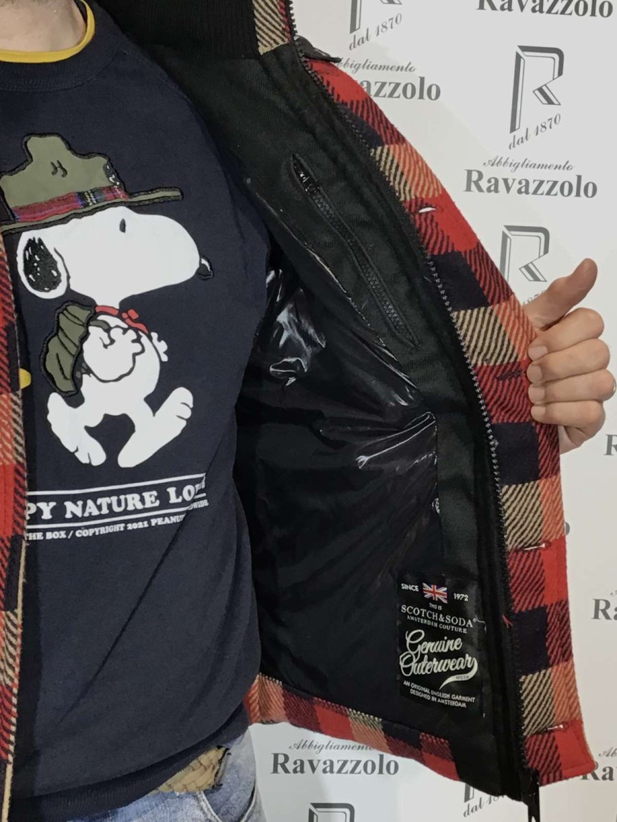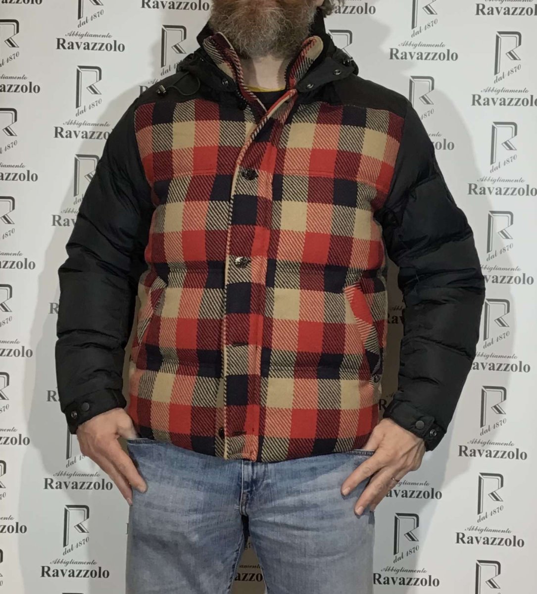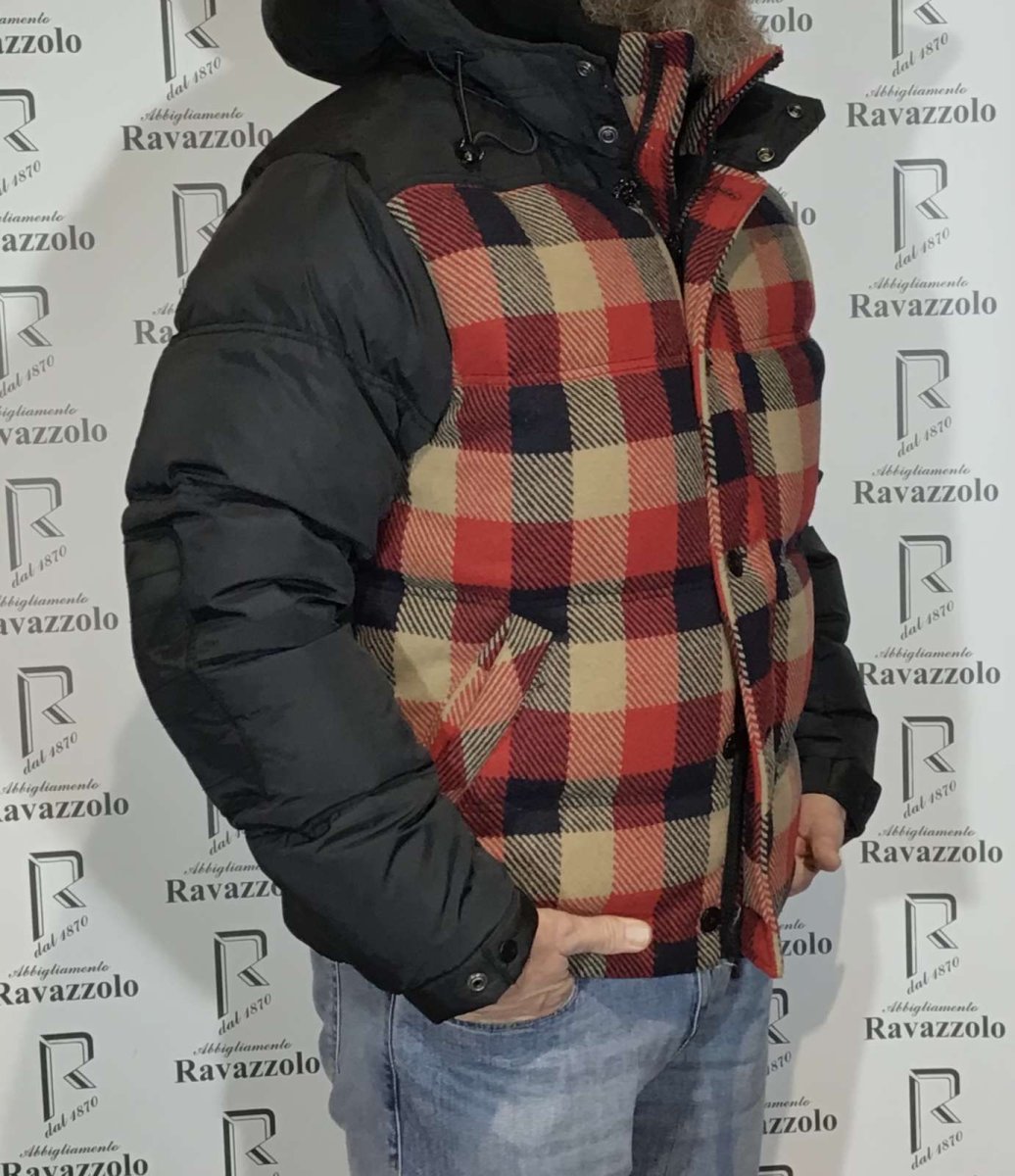 SCOTCH&SODA mod. 1004-09.10049 col. A, piumino uomo imbottito in VERA PIUMA , tessuto tecnico accoppiato con lana in fantasia quadri, con doppia chiusura in zip nascosta e bottoni, collo in maglia stretch, cappuccio fisso e due comodi tasconi.