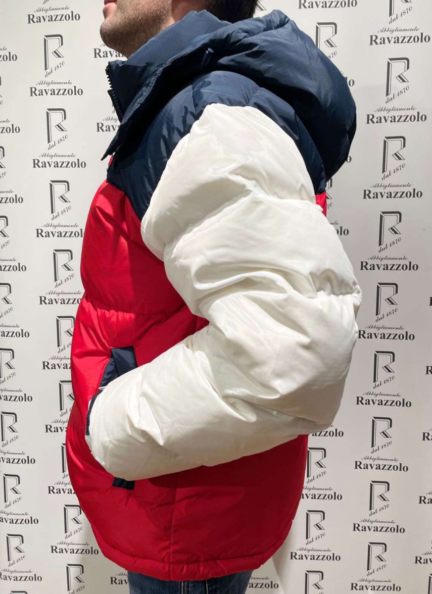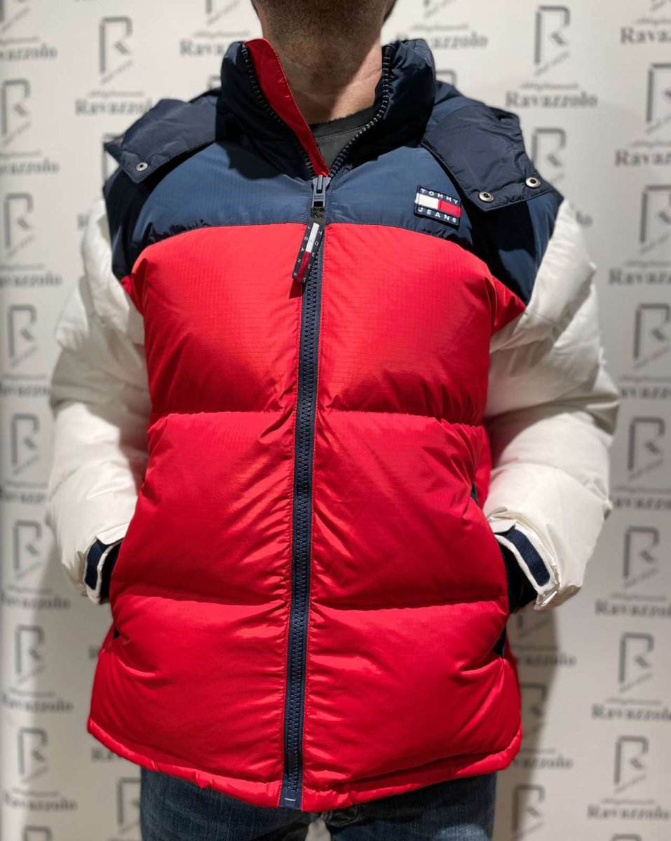 TOMMY JEANS mod. DM14460 col. C87, giaccone uomo ECO-DOWN imbottitura 100% RECYCLED, tessuto esterno in RIPSTOP fabrics, cappuccio staccabile, due calde tasche a contrasto ed esclusivo effetto tri-colorย iconic style by TOMMY HILFIGER.