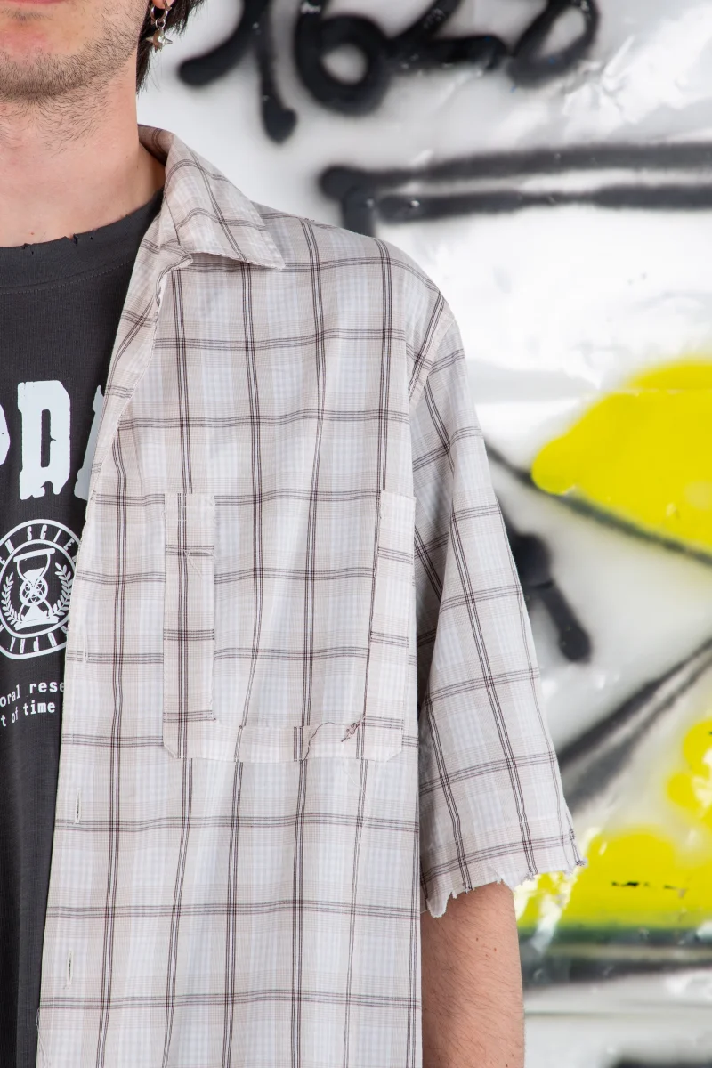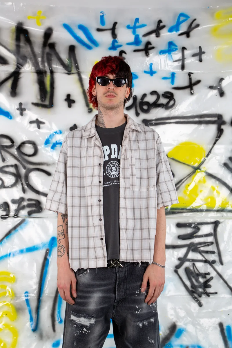 Camicia Boxy Fit in 100% Cotone “popeline”, tipicamente usato per le camice eleganti. Tramite lavaggi ed effetto ripped l’abbiamo trasformato rendendo un cotone elegante, piรน streetwear. Arricchita dalla stampa serigrafica sul retro realizzata a mano.