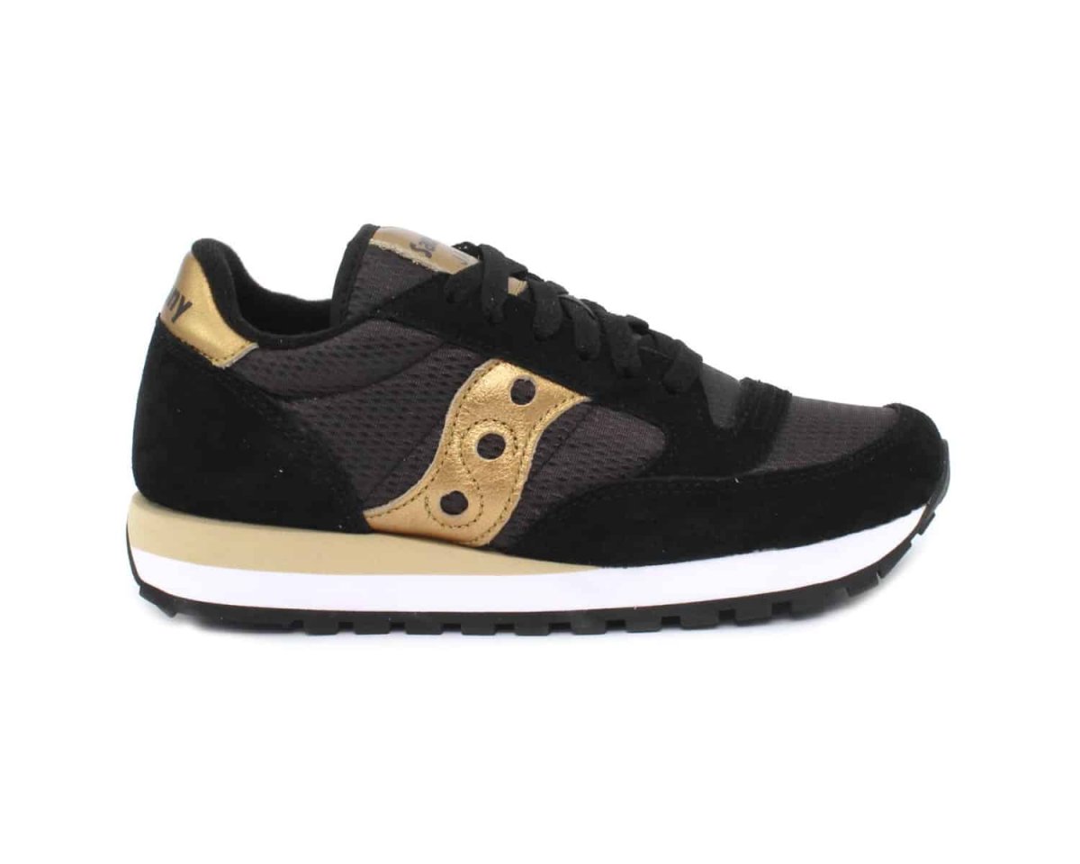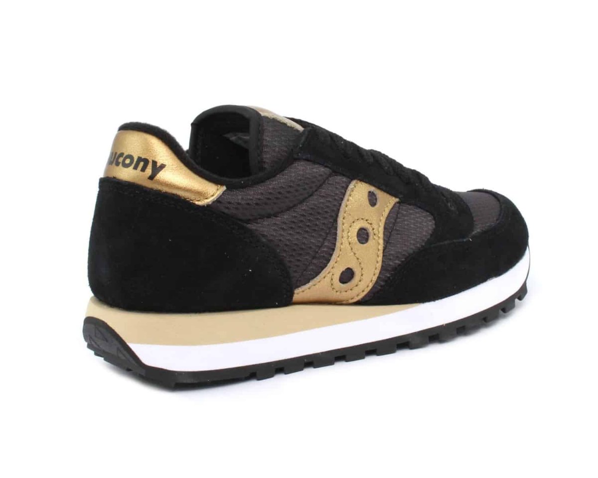 Scarpa Saucony Jazz Original colore nero oro .L’alta qualitร costruttiva delle sneakers Jazz Saucony Originals si sposa con il massimo comfort e l’incredibile leggerezza. La tomaia in morbida pelle scamosciata con inserti in nylon ha uno stile unico e inconfondibile. L’intersuola, in Eva leggerissima, offre una perfetta combinazione tra stabilitร e ammortizzazione del piede. La suola in gomma garantisce un’ottima resistenza all’usura.