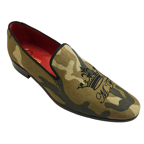 Scarpe mocassino slippers in tessuto camouflage con ricamo corona e teschio piรน iniziali personalizzabili, disponibili nei colori riferimento cartella in foto, realizzate su ordinazione personalizzabili anche con iniziali sul lato con costo aggiuntivo di 15,00 euro