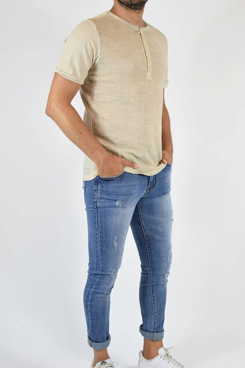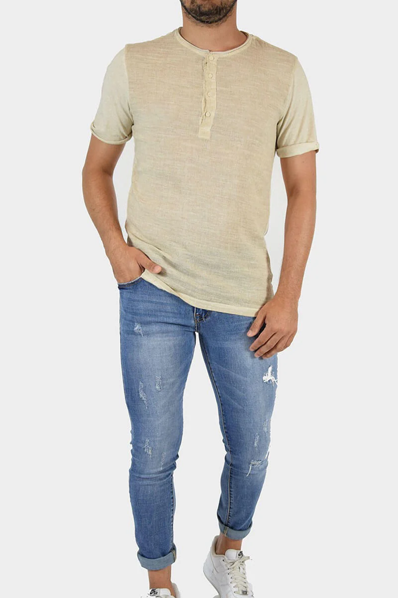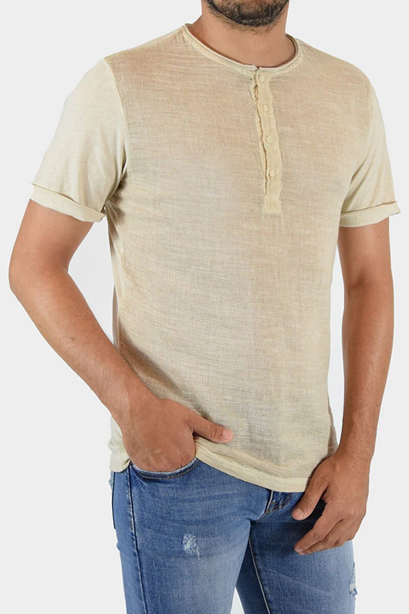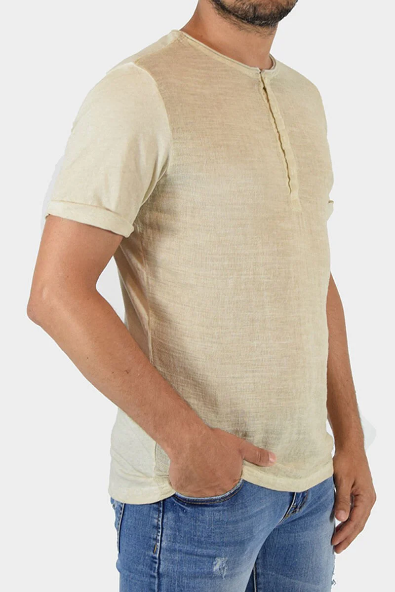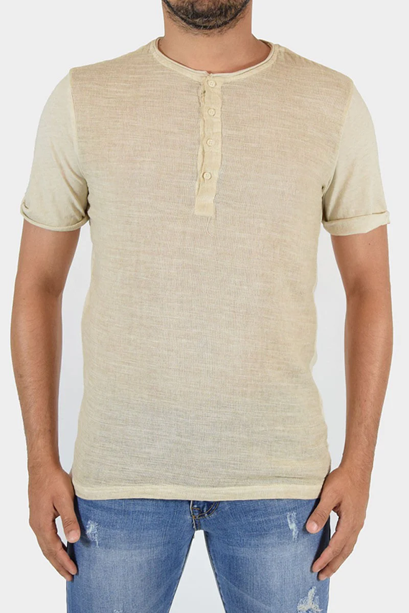 T-SHIRT A CONTRASTO CON BOTTONI COLORE: Beige COMPOSIZIONE: 60% Cotone 40% Lino ALTEZZA MODELLO: 185 cm TAGLIA L