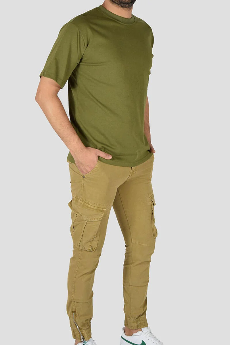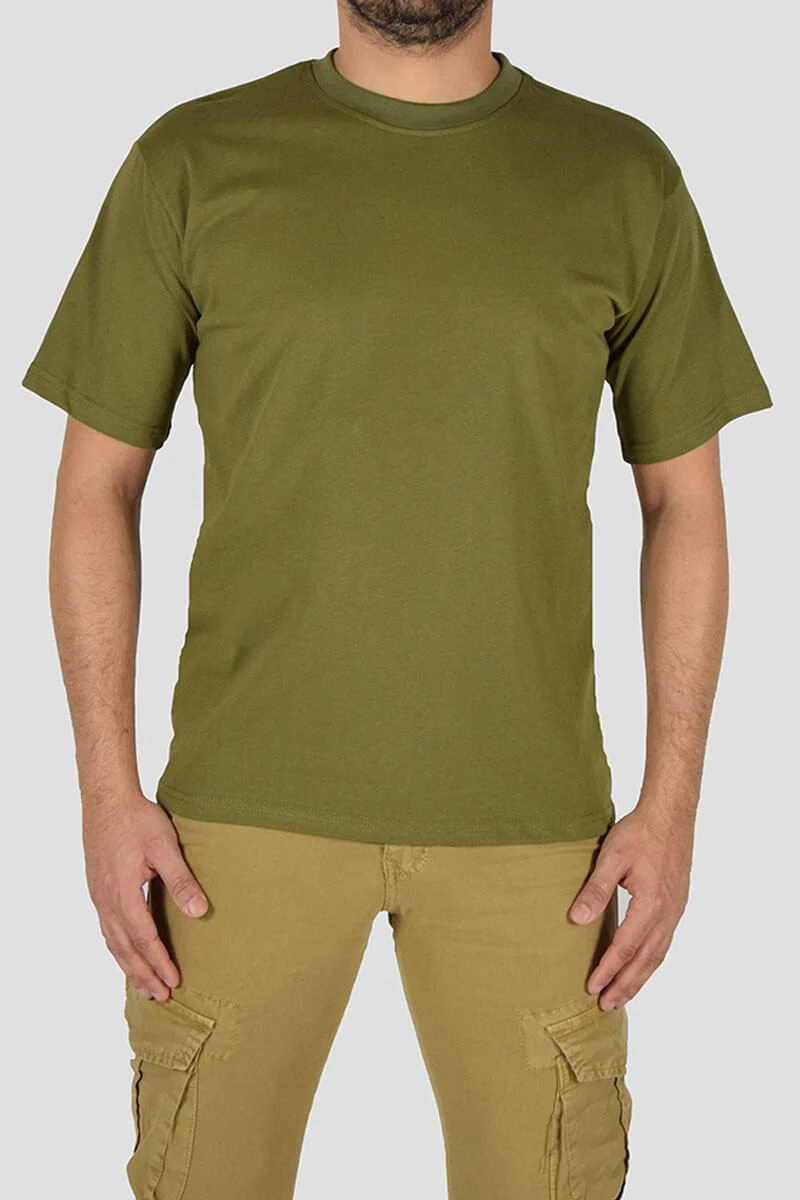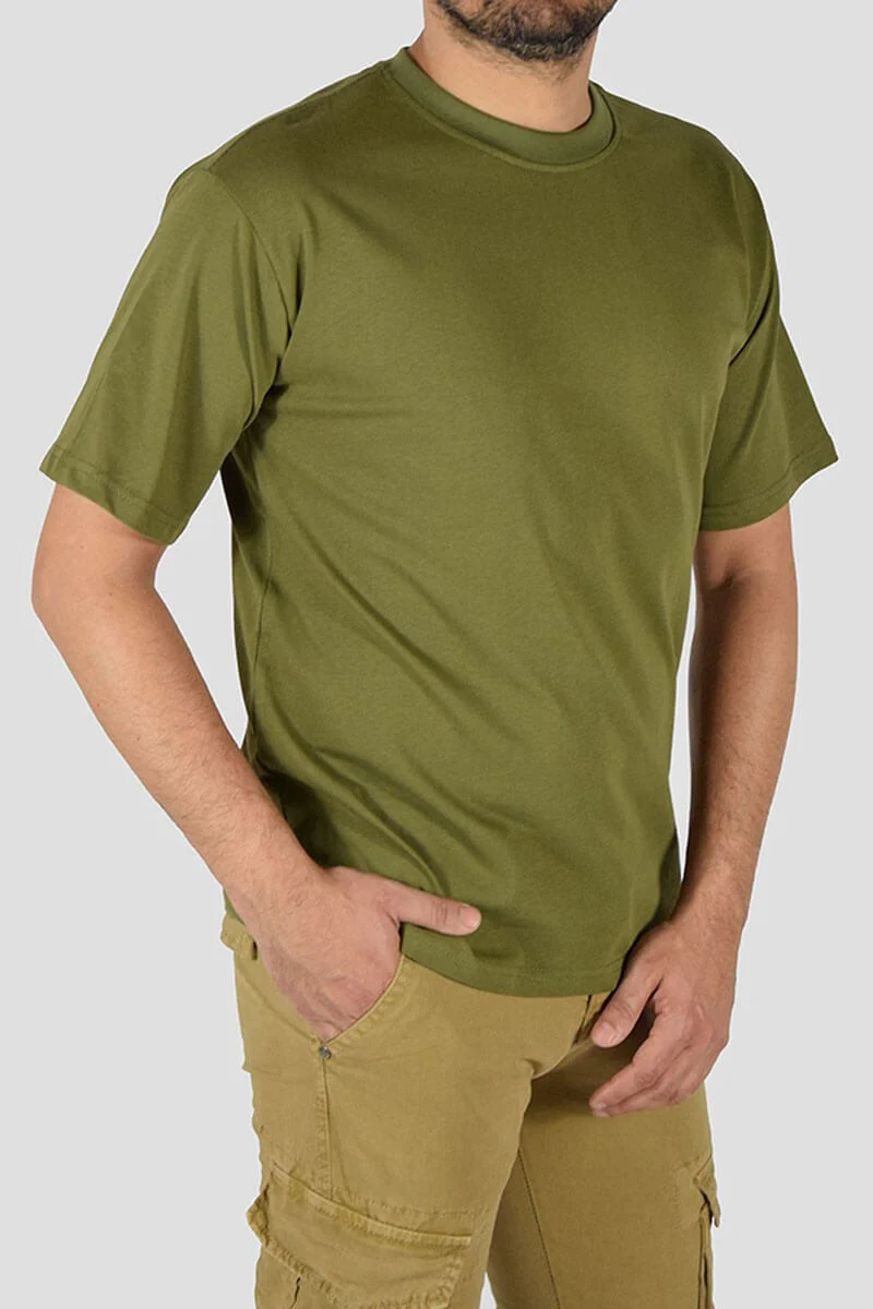 T-SHIRT BASIC COLORE: Verde militare COMPOSIZIONE: 100% Cotone ALTEZZA MODELLO: 185 cm TAGLIA L