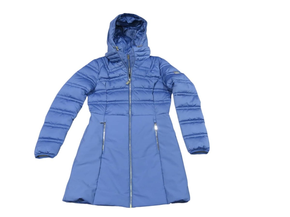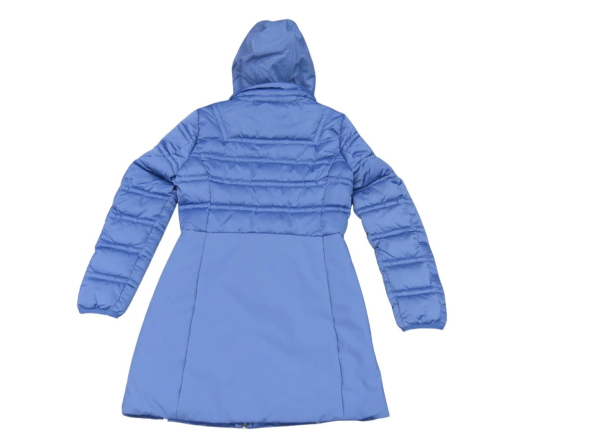 Giubbino piumino donna lungo con cappuccio e finto gilet staccabili,ย tessuto esterno in nylon e soft shell,ย imbottitura interna sintetica, col celeste