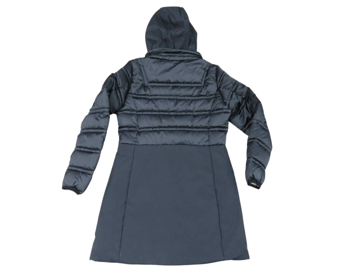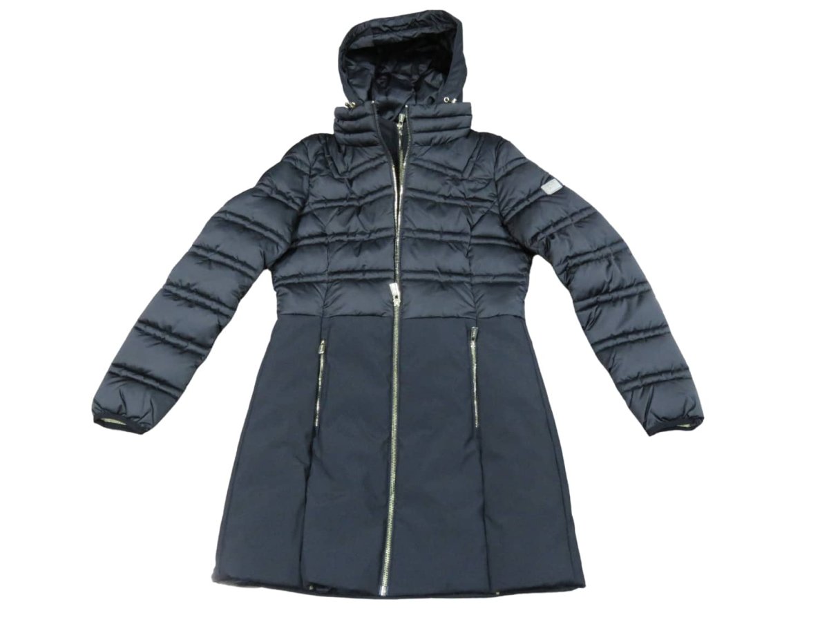 Giubbino piumino donna lungo con cappuccio e finto gilet staccabili,ย tessuto esterno in nylon e soft shell,ย imbottitura interna sintetica, col nero